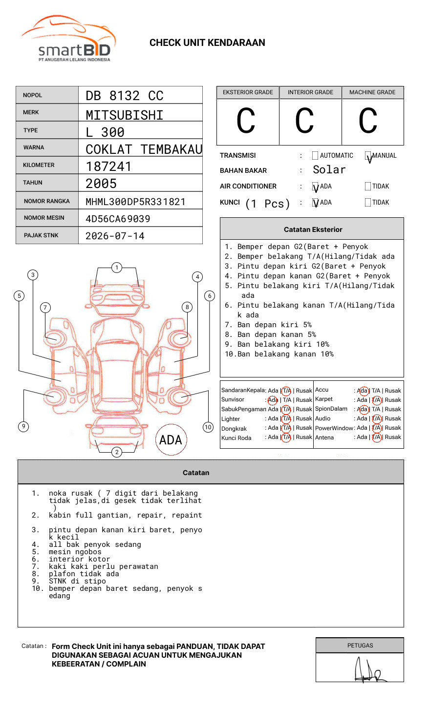 SEBELUM MELAKUKAN PENAWARAN UNIT PESERTA LELANG WAJIB MELAKUKAN PENGECEKAN UNIT DAN DOKUMEN TERLEBIH DAHULU // PIC AWAL +62 895-3231-57272 / ANDRI 085136886212 // UNIT DIKENAKAN BIAYA PPN 1.1% DARI HARGA TERBENTUK // ADA PERBEDAAN WARNA PADA FISIK DAN STNK HITAM METALIK PADA BPKB COKLAT TEMBAKAU // TIDAK ADA KET RUBAH WARNA PADA BPKB // NOKA REKONDISI / KETRIK ULANG // PEMENENANG LELANG WAJIB MENANDATANGANI SURAT PERNYATAAN BERMATERAI