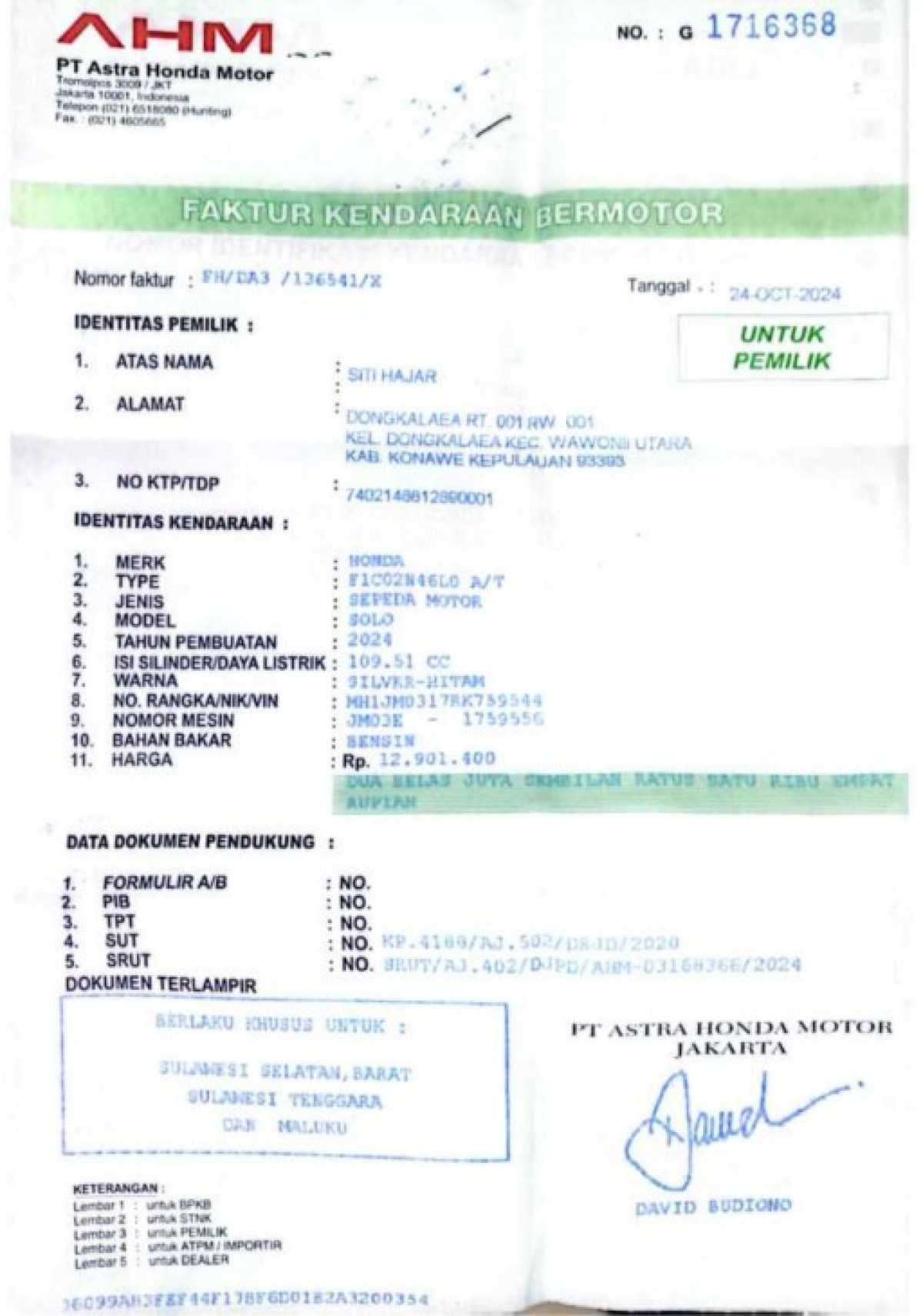 | No. Polisi | : | DT 6550 CO |