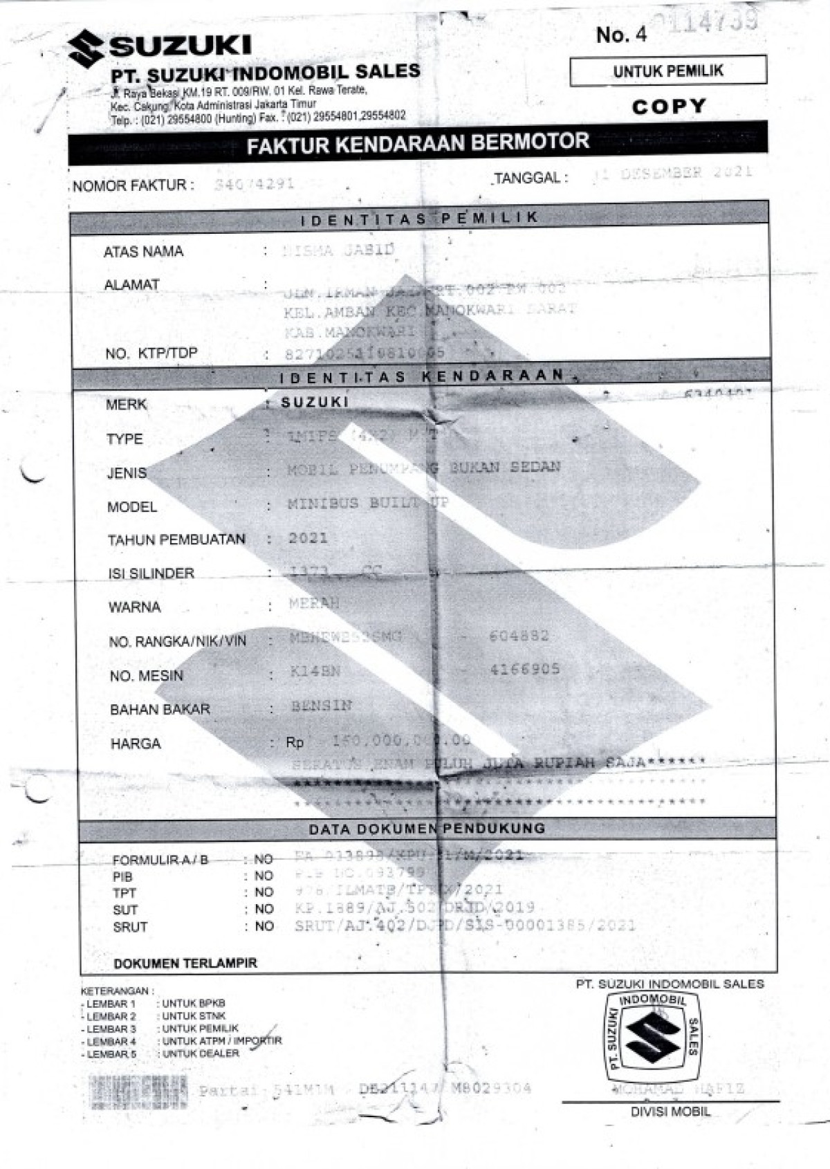 ADA TAMBAHAN BIAYA PARKIR 1.000.000 DIBEBANKAN KEPADA PEMENANG LELANG // UNIT TIDAK DILAKUKAN PENGECEKAN OLEH TIM SMARTBID// SEBELUM MELAKUKAN PENAWARAN HARAP CEK KONDISI UNIT DAN DOKUMEN TERLEBIH DAHULU// WAJIB MENGHUBUNGI PIC DAN DATANG KE LOKASI UNTUK PENGECEKAN UNIT// UNIT DILELANG APA ADANYA PERMASALAHAN YANG TIMBUL DILUAR TANGGUNG JAWAB SMARTBID// PENGAMBILAN UNIT SLIDE H+2 DARI PELUNASAN // JIKA INGIN MENGAMBIL UNIT HARAP UNTUK KONFIRMASI DAHULU KE SMARTBID // JIKA YANG MENGAMBIL BIDDER HARAP MEMBAWA KTP ASLI // JIKA PENGAMBILAN DIWAKILKAN WAJIB MEMBAWA SURAT KUASA ASLI // UNIT DIKENAKAN BIAYA PPN 1,1% DARI HARGA TERBENTUK// PEMENANG LELANG DIKENAKAN BIAYA ROYA FIDUSIA 100.000 // HUBUNGI PIC ( ADA DILIST SELLER)