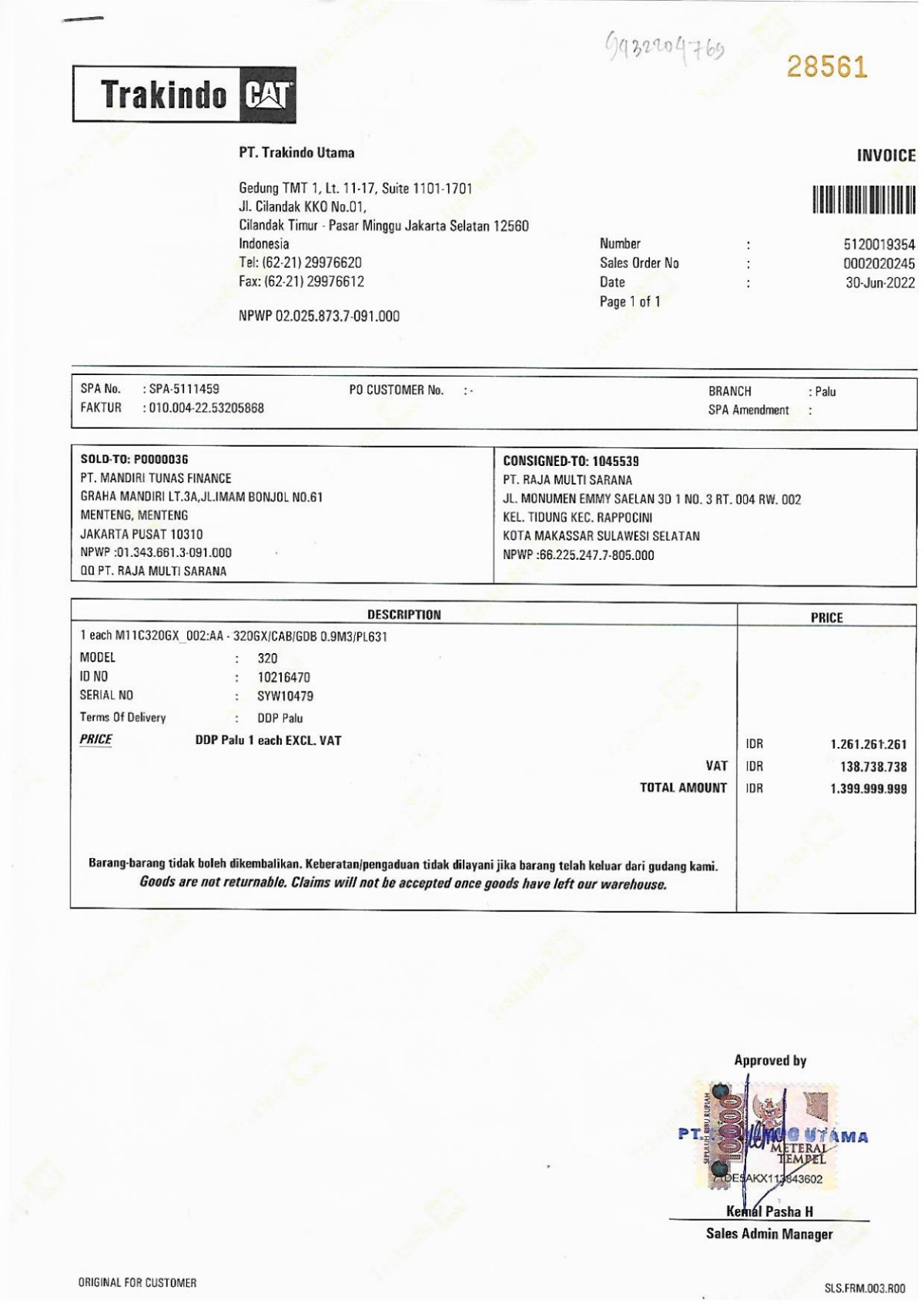 | No. Rangka | : | CAT00320PSYW10479 |