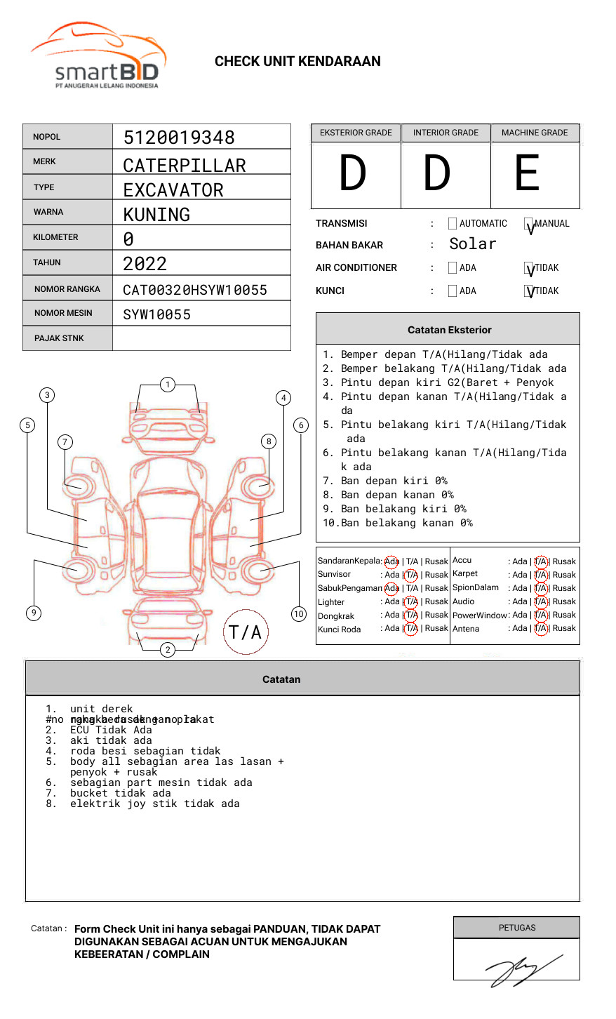 SEBELUM MELAKUKAN PENAWARAN UNIT PESERTA LELANG WAJIB MELAKUKAN PENGECEKAN UNIT DAN DOKUMEN TERLEBIH DAHULU // PIC AWAL +62 895-3231-57272 / ANDRI 085136886212 // UNIT DIKENAKAN BIAYA PPN 1.1% DARI HARGA TERBENTUK // ADA BIAYA ROYA FIDUCIA 100,000 DITANGGUNG PEMENANG // SPH TANPA MATERAI //