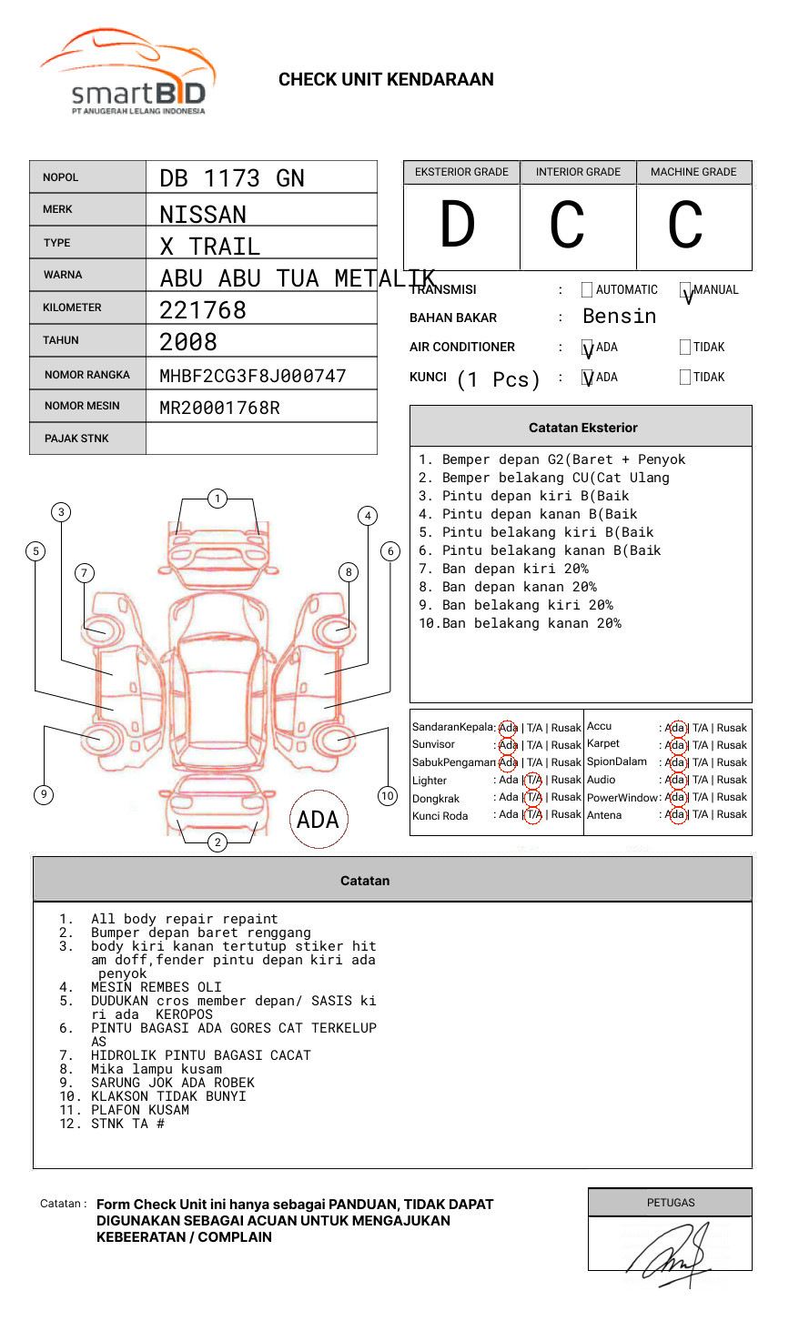 SEBELUM MELAKUKAN PENAWARAN UNIT PESERTA LELANG WAJIB MELAKUKAN PENGECEKAN UNIT DAN DOKUMEN TERLEBIH DAHULU // UNIT TIDAK DAPAT DILAKUKAN CEK E-SAMSAT (PENAWAR WAJIB MENGECEK TERLEBIH DAHULU)// PIC MAS UD : 081213061687
