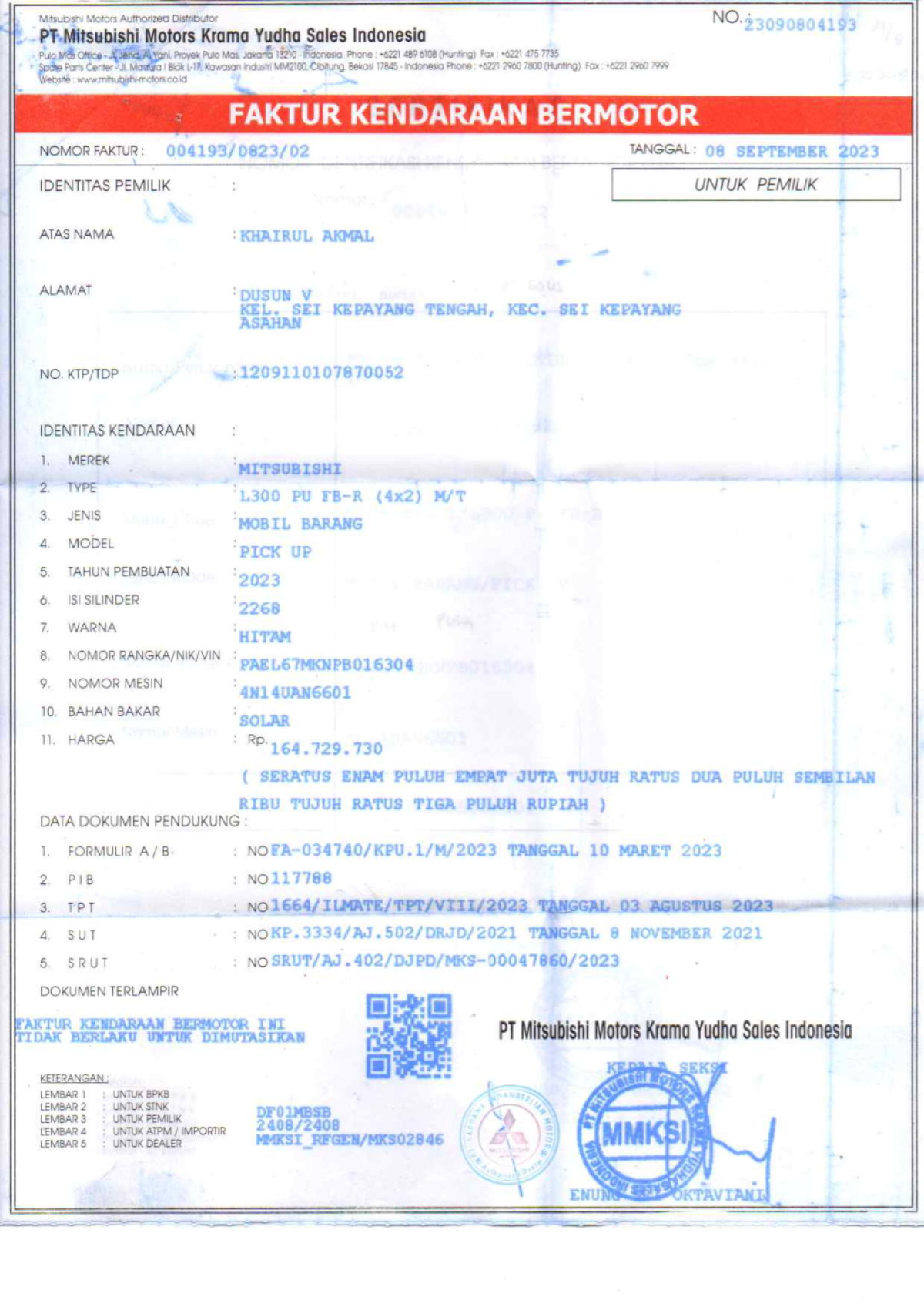| No. Rangka | : | PAEL67MKNPB016304 |