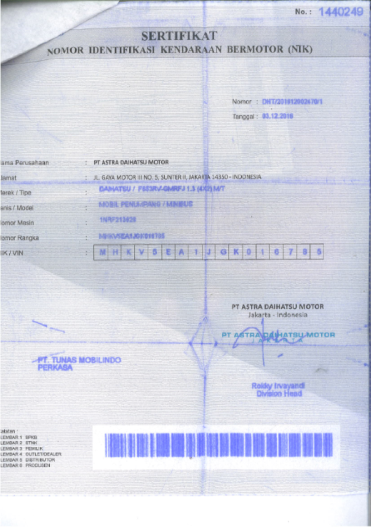 | No. Rangka | : | MHKV5EAIJGK016785 |