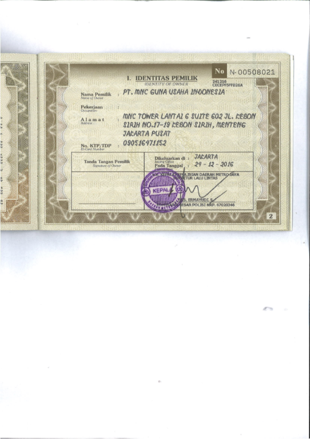 | FK. KTP | : | Tidak Ada |