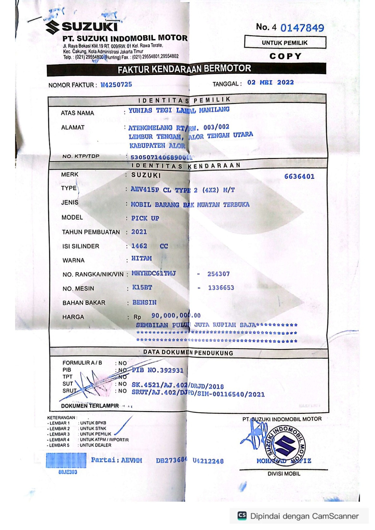 UNIT TIDAK DILAKUKAN PENGECEKAN OLEH TIM SMARTBID// SEBELUM MELAKUKAN PENAWARAN HARAP CEK KONDISI UNIT DAN DOKUMEN TERLEBIH DAHULU// WAJIB MENGHUBUNGI PIC DAN DATANG KE LOKASI UNTUK PENGECEKAN UNIT// UNIT DILELANG APA ADANYA PERMASALAHAN YANG TIMBUL DILUAR TANGGUNG JAWAB SMARTBID// PENGAMBILAN UNIT SLIDE H+2 DARI PELUNASAN // JIKA INGIN MENGAMBIL UNIT HARAP UNTUK KONFIRMASI DAHULU KE SMARTBID // JIKA YANG MENGAMBIL BIDDER HARAP MEMBAWA KTP ASLI // JIKA PENGAMBILAN DIWAKILKAN WAJIB MEMBAWA SURAT KUASA ASLI // UNIT DIKENAKAN BIAYA PPN 1,1% DARI HARGA TERBENTUK// HUBUNGI PIC SUSI 0821-4439-4968 / HUB CS PUSAT 0811119678