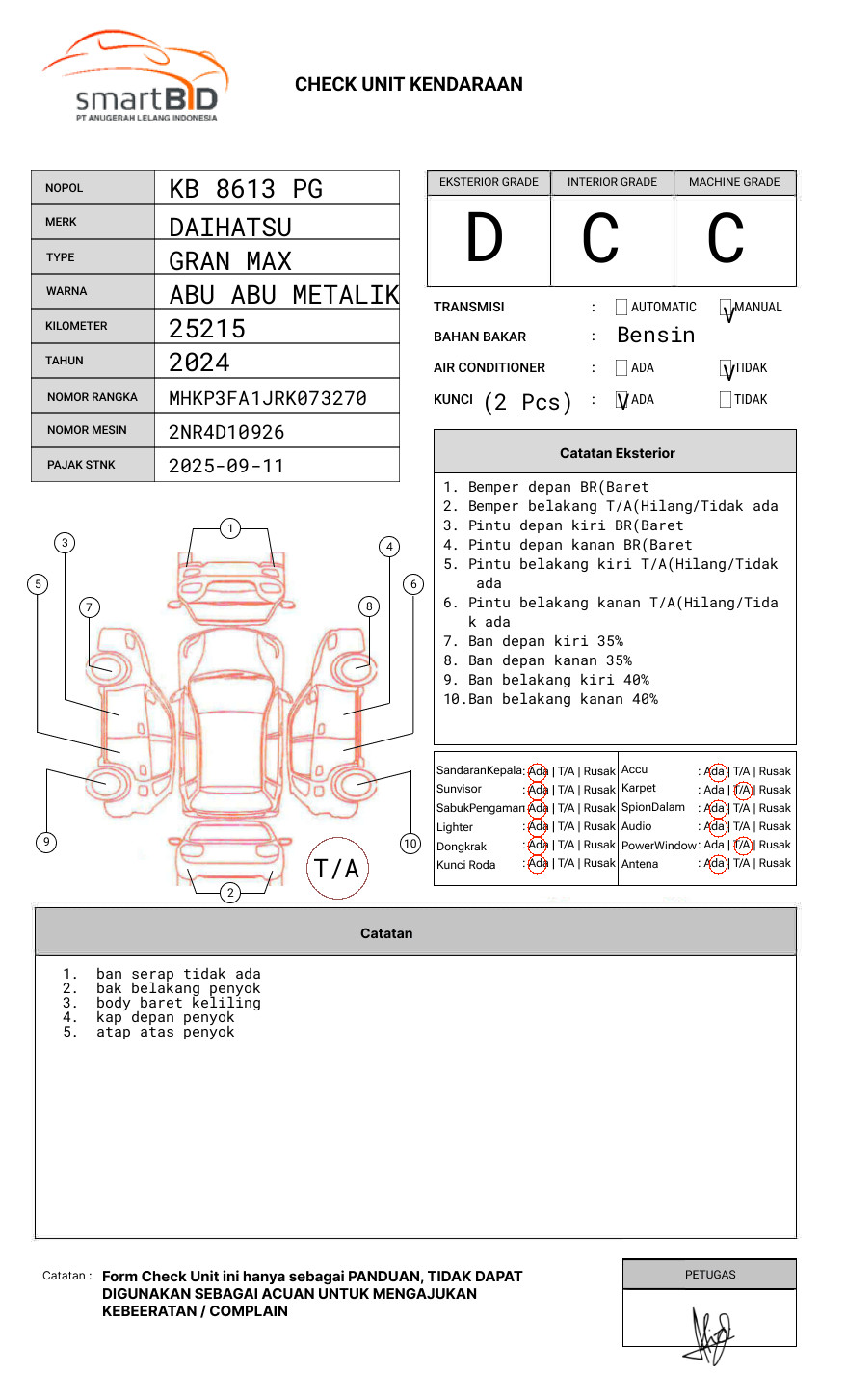 SEBELUM MELAKUKAN PENAWARAN UNIT PESERTA LELANG WAJIB MELAKUKAN PENGECEKAN UNIT DAN DOKUMEN TERLEBIH DAHULU // PIC FELIX +62 858-2222-4863 // UNIT DIKENAKAN BIAYA PPN 1.1% DARI HARGA TERBENTUK // UNIT DIKENAKAN BIAYA ROYA FIDUSIA 100.000