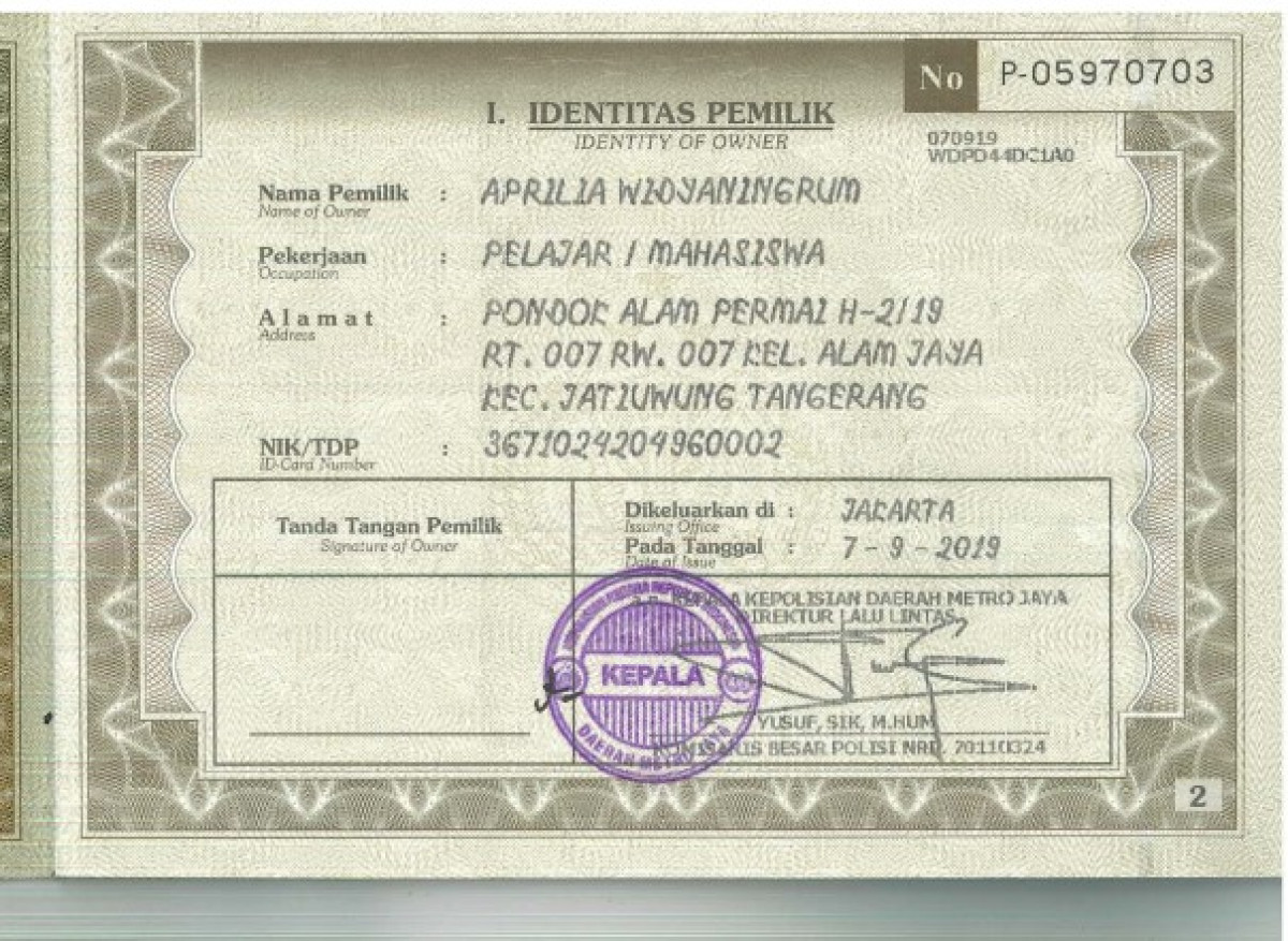 | No. Polisi | : | B 1880 CMU |