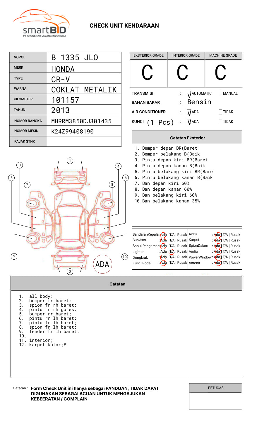 SEBELUM MELAKUKAN PENAWARAN UNIT PESERTA LELANG WAJIB MELAKUKAN PENGECEKAN UNIT DAN DOKUMEN TERLEBIH DAHULU //DENNY +62 852-9442-5362 UNIT DIKENAKAN BIAYA PPN 1.1% DARI HARGA TERBENTUK // NOPOL FISIK T/A //