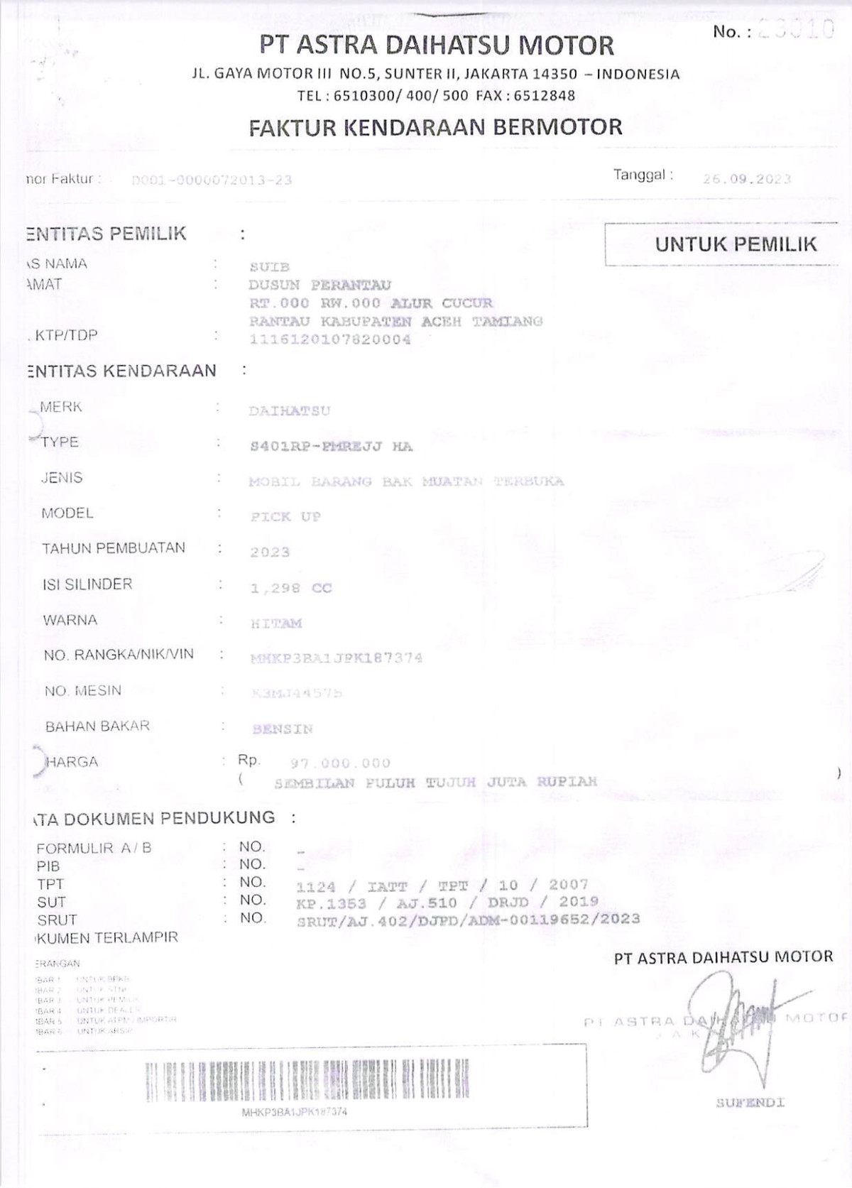 | No. Rangka | : | MHKP3BA1JPK187374 |