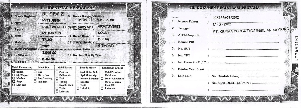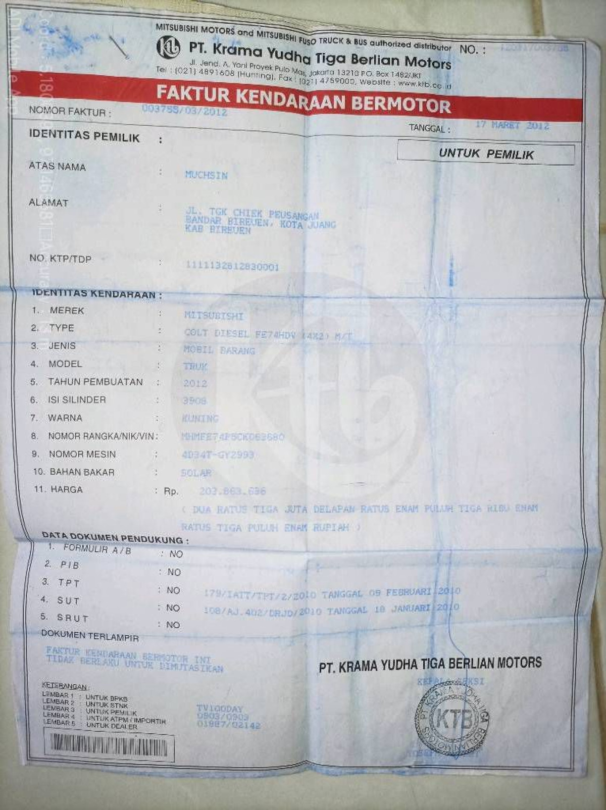 UNIT TIDAK DILAKUKAN PENGECEKAN OLEH TIM SMARTBID// SEBELUM MELAKUKAN PENAWARAN HARAP CEK KONDISI UNIT DAN DOKUMEN TERLEBIH DAHULU// WAJIB MENGHUBUNGI PIC DAN DATANG KE LOKASI UNTUK PENGECEKAN UNIT// UNIT DILELANG APA ADANYA PERMASALAHAN YANG TIMBUL DILUAR TANGGUNG JAWAB SMARTBID// PENGAMBILAN UNIT SLIDE H+2 DARI PELUNASAN // JIKA INGIN MENGAMBIL UNIT HARAP UNTUK KONFIRMASI DAHULU KE SMARTBID // JIKA YANG MENGAMBIL BIDDER HARAP MEMBAWA KTP ASLI // JIKA PENGAMBILAN DIWAKILKAN WAJIB MEMBAWA SURAT KUASA ASLI // UNIT DIKENAKAN BIAYA PPN 1,1% DARI HARGA TERBENTUK// LOKASI UNIT HUBUNGI CS PUSAT 081188089292// MESIN HIDUP, BODY BARET, DI BPKB TYPE LIGHT TRUK SEDANGKAN FISIK UNIT DUMP TRUCK, LAPIS JOK IMITASI, LANTAI CABIN BERKARAT, BAN TIPIS, BUMPER DEPAN BERKARAT, LANTAI & DINDING BAK BERKARAT//Tire (Rr-R) out | Air Filter | Brake Master | Tire (spare) | Clutch Plate | Tire (Fr-L) | Tire (Rr-L) in | Engine Services (Light) | Tire (Rr-R) in | Key (no immobilizer) | Fan Belt | Tire (Rr-L) out | Wheel Bearing (Fr) | Battery | Brake Pad (Rr) | Rack Steer | Tire (Fr-R) | Wheel Bearing (Rr) | Shocbreakers (Rr) | Shocbreakers (Fr) | Brake Pad (Fr)/Carpet | Ceiling Trim | Interior Saloon | Bolt Crane and Jack | Tool Kit/License Plat | Door Repair (Fr-R) | Roof Repair | Bumper Repair (Fr) | Cargo Panel Repair (Deck) | Cargo Panel Repair (Rr) | Front panel repair | Door Repair (Fr-L) | Fender Repair (Fr-R) | Fender Repair (Fr-L)