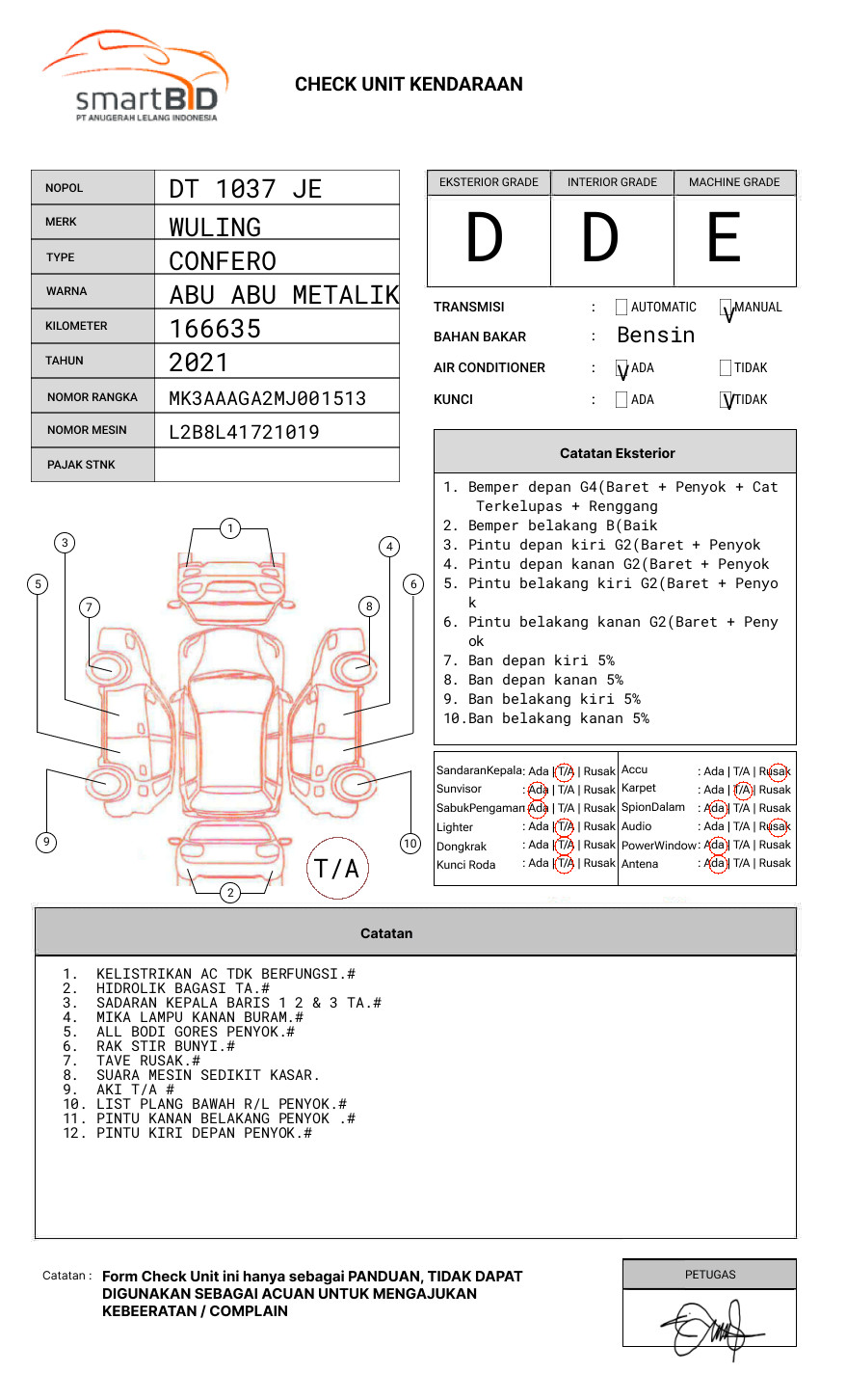 SEBELUM MELAKUKAN PENAWARAN UNIT PESERTA LELANG WAJIB MELAKUKAN PENGECEKAN UNIT DAN DOKUMEN TERLEBIH DAHULU//PIC AHMAD 0823-4527-8181 DAN IKRAM 0852-4158-7738//COPY BPKB DAN FAKTUR T/A //