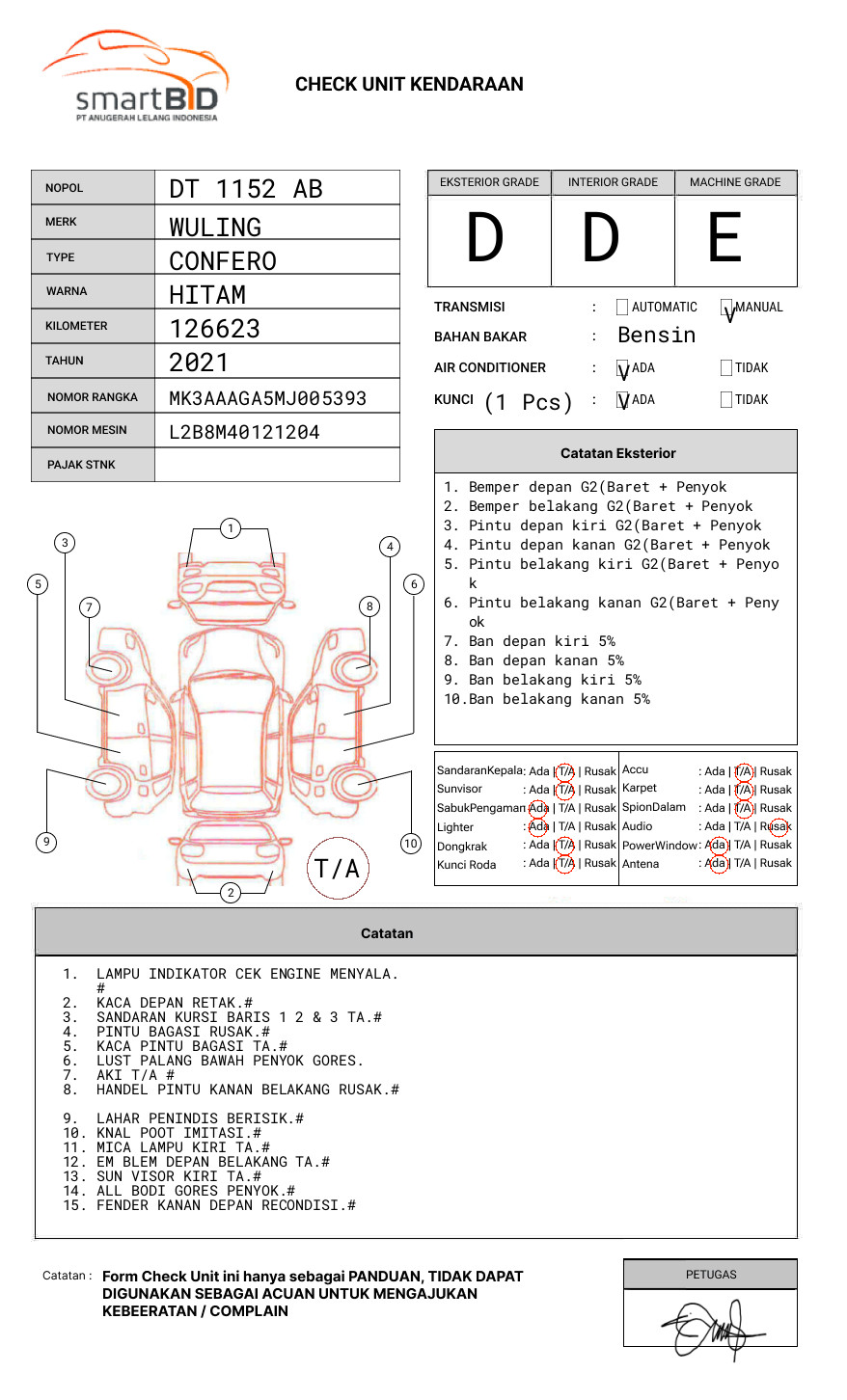 SEBELUM MELAKUKAN PENAWARAN UNIT PESERTA LELANG WAJIB MELAKUKAN PENGECEKAN UNIT DAN DOKUMEN TERLEBIH DAHULU//PIC AHMAD 62 823-4527-8181 //COPY FAKTUR & BPKB T/A // NOSIN TDK TERJANGKAU // NOPOL FISIK T/A //