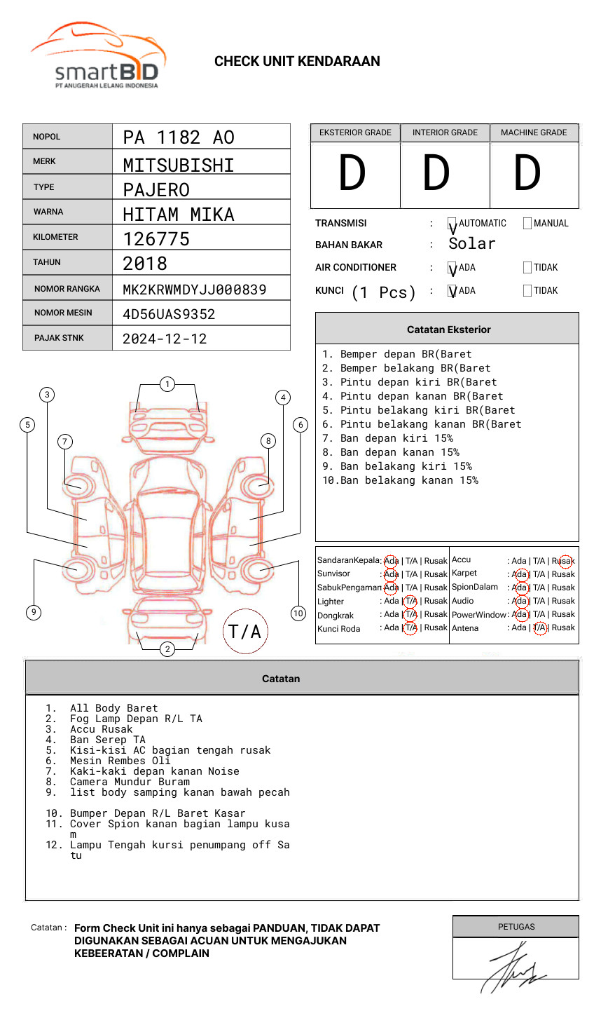 SEBELUM MELAKUKAN PENAWARAN UNIT PESERTA LELANG WAJIB MELAKUKAN PENGECEKAN UNIT DAN DOKUMEN TERLEBIH DAHULU //PIC ANDY 62 819-1822-5889// COPY BPKB DAN FAKTUR TA.// NOPOL FISIK TA//