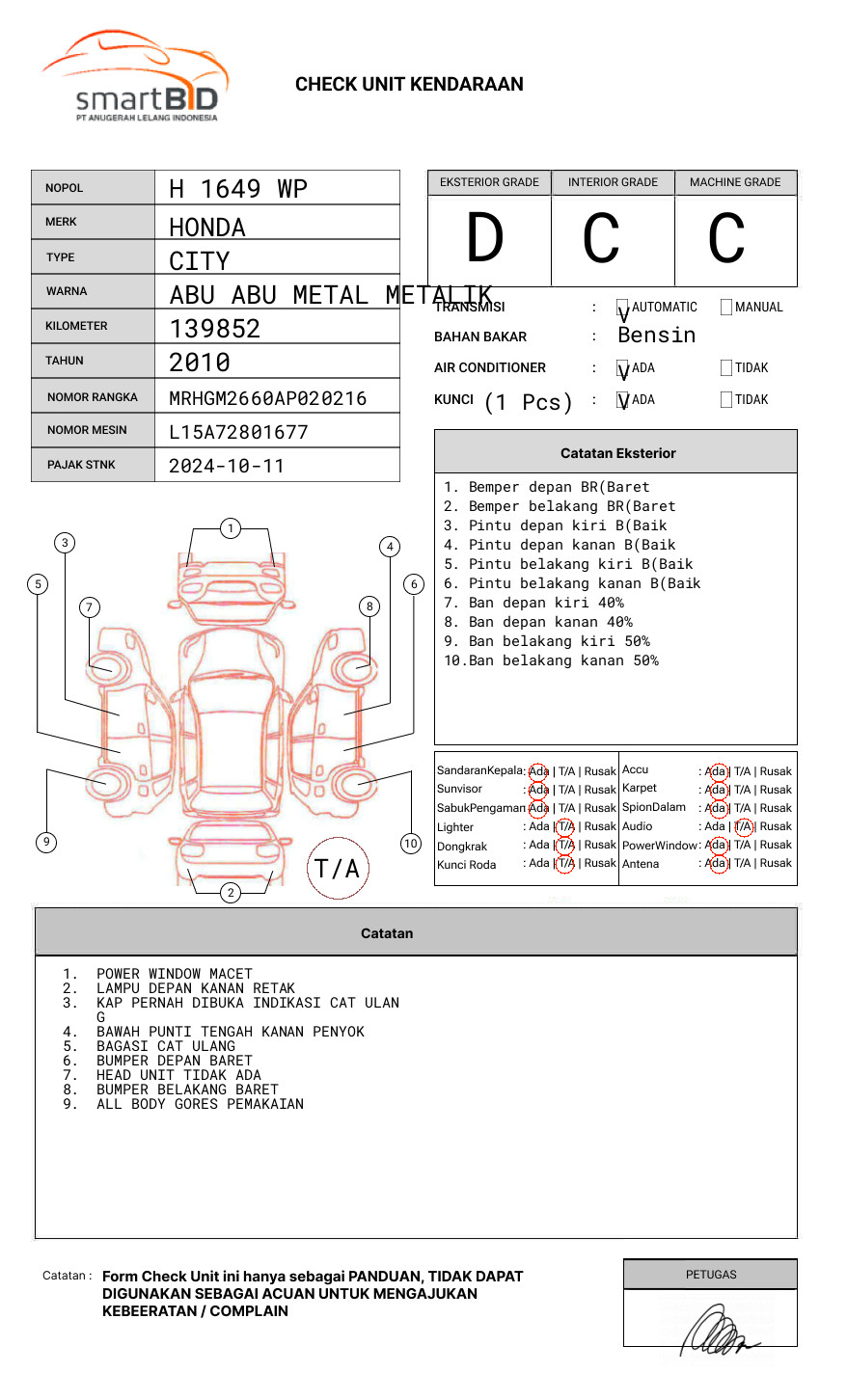 SEBELUM MELAKUKAN PENAWARAN UNIT PESERTA LELANG WAJIB MELAKUKAN PENGECEKAN UNIT DAN DOKUMEN TERLEBIH DAHULU // PIC TIAN : +62 896-6265-5959 // UNIT DIKENAKAN BIAYA PPN 1.1% DARI HARGA TERBENTUK // UNIT TIDAK DAPAT DILAKUKAN CEK E-SAMSAT (PENAWAR WAJIB MENGECEK TERLEBIH DAHULU)