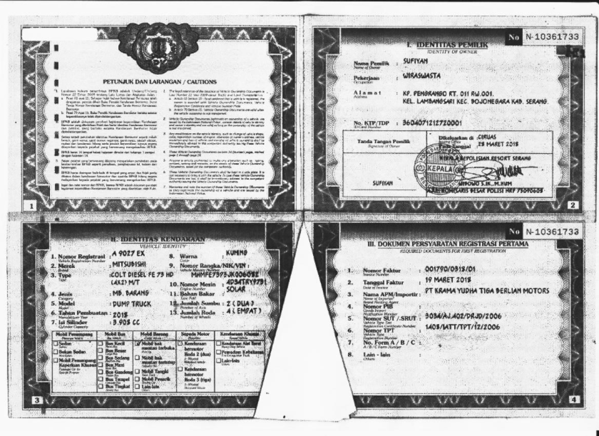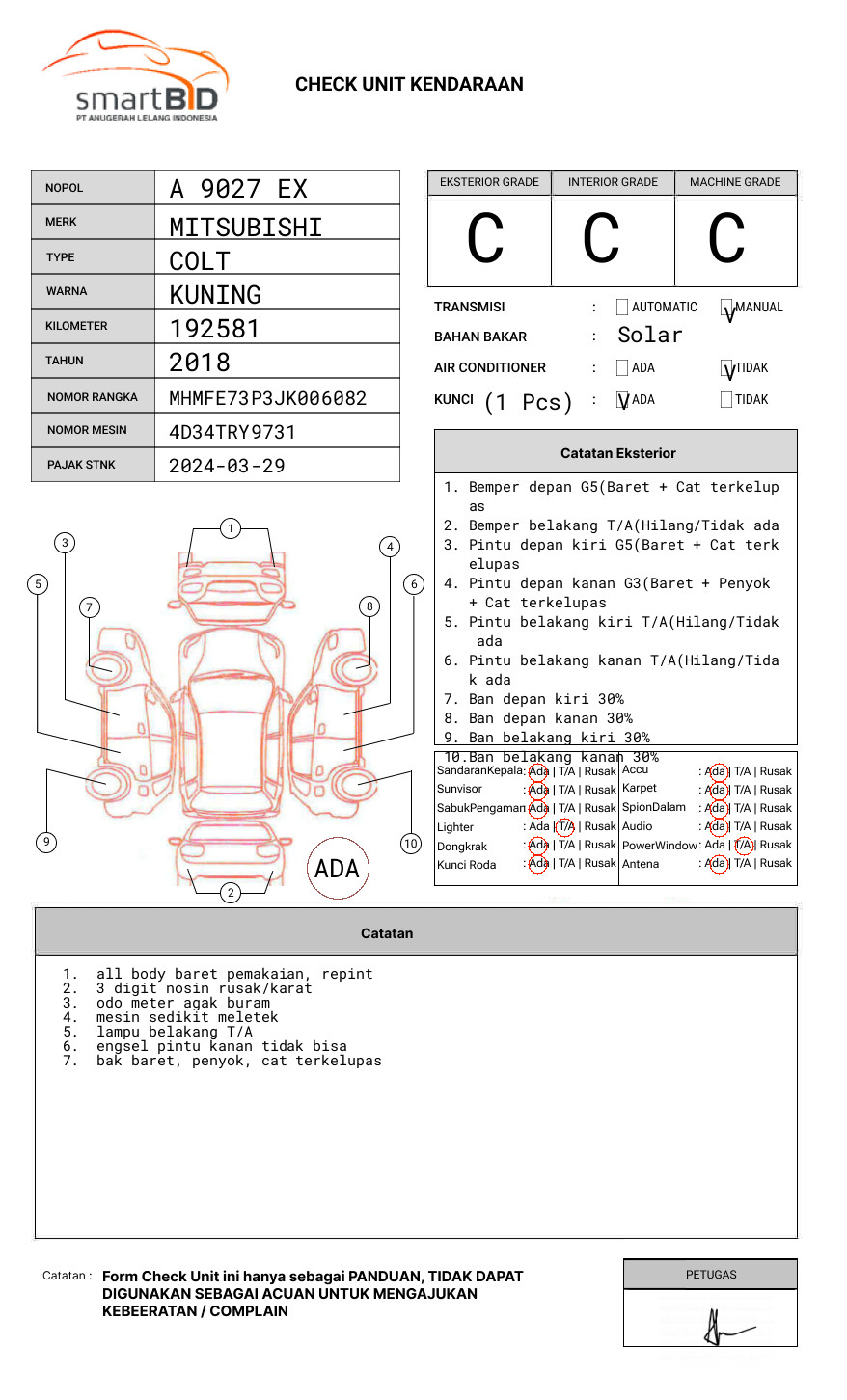 SEBELUM MELAKUKAN PENAWARAN HARAP CEK KONDISI UNIT SERTA DOKUMEN TERLEBIH DAHULU// UNIT DIKENAKAN BIAYA PPN 1,1% DARI HARGA TERBENTUK// UNIT TIDAK DAPAT DILAKUKAN CEK E-SAMSAT (PENAWAR WAJIB MENGECEK TERLEBIH DAHULU)// 3 DIGIT AKHIR NOSIN FISIK KURANG JELAS// PIC WAHYU : 082124062748