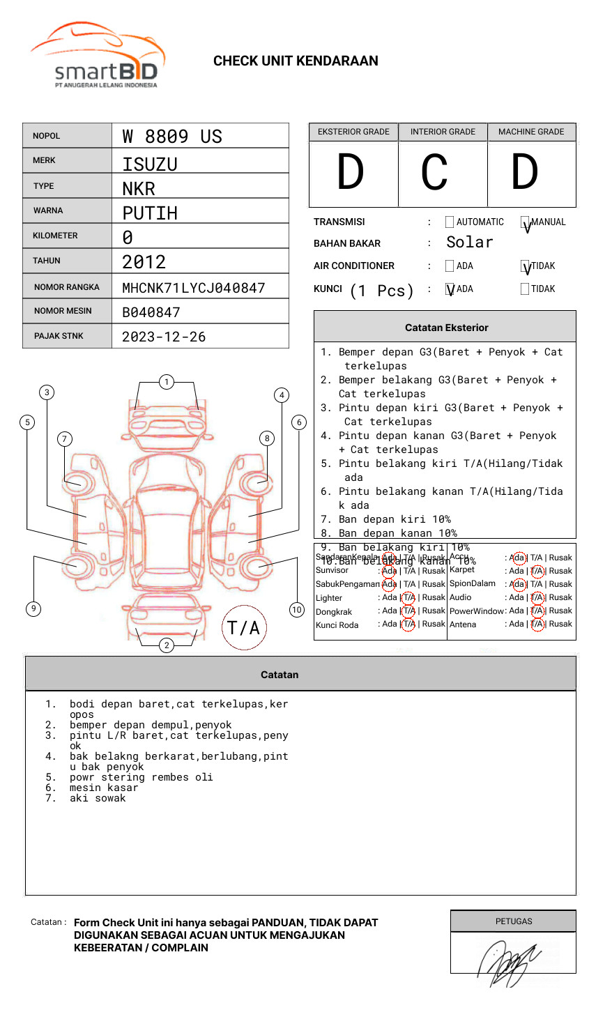 NOPOL FISIK T/A // SEBELUM MELAKUKAN PENAWARAN UNIT PESERTA LELANG WAJIB MELAKUKAN PENGECEKAN UNIT DAN DOKUMEN TERLEBIH DAHULU // PIC JEMY : 0852-5833-5777 // INSPEKSI AGUNG : 0852-3671-4592 // UNIT DIKENAKAN BIAYA PPN 1.1% DARI HARGA TERBENTUK //