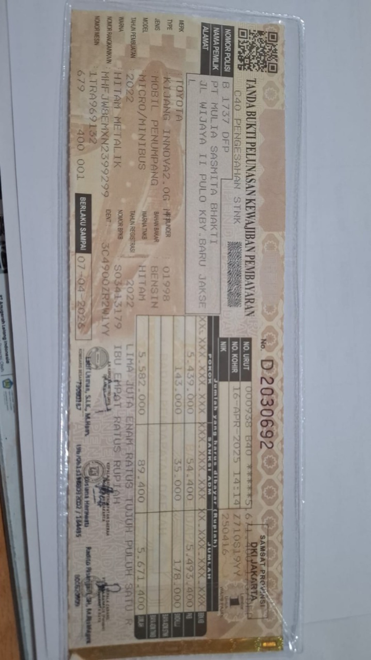 No. Polisi | : | B 1737 DFP |