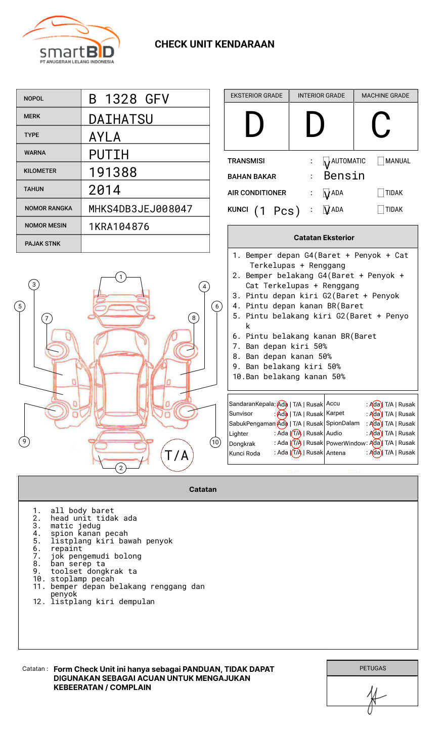 SEBELUM MELAKUKAN PENAWARAN HARAP CEK KONDISI UNIT SERTA DOKUMEN TERLEBIH DAHULU// UNIT DIKENAKAN BIAYA PPN 1,1% DARI HARGA TERBENTUK// TERDAPAT PERBEDAAN NOPOL FISIK DGN DOKUMEN// PADA NOPOL FISIK "T 1349 MW" SEDANGKAN NOPOL PADA DOKUMEN "B 1328 GFV"// INDIKASI NOPOL PALSU/BBN GANTUNG// PIC WAHYU : 082124062748