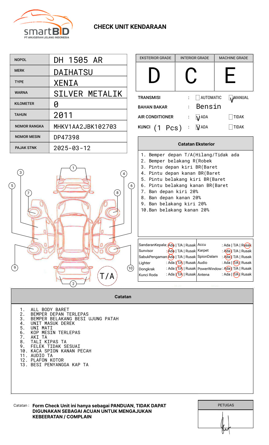 NOPOL PADA FISIK T/A // SEBELUM MELAKUKAN PENAWARAN UNIT PESERTA LELANG WAJIB MELAKUKAN PENGECEKAN UNIT DAN DOKUMEN TERLEBIH DAHULU // PIC BOY +62 821-8725-3174 / ASMAR 082278281728 // UNIT DIKENAKAN BIAYA PPN 1.1% DARI HARGA TERBENTUK //
