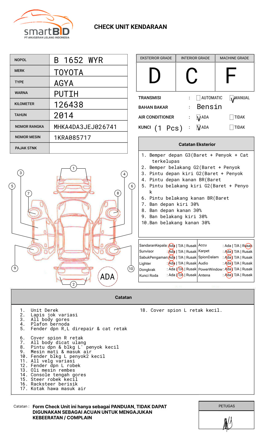 SEBELUM MELAKUKAN PENAWARAN UNIT PESERTA LELANG WAJIB MELAKUKAN PENGECEKAN UNIT DAN DOKUMEN TERLEBIH DAHULU // PIC GERMAN : 0812-6517-3060 // UNIT DIKENAKAN BIAYA PPN 1.1% DARI HARGA TERBENTUK //