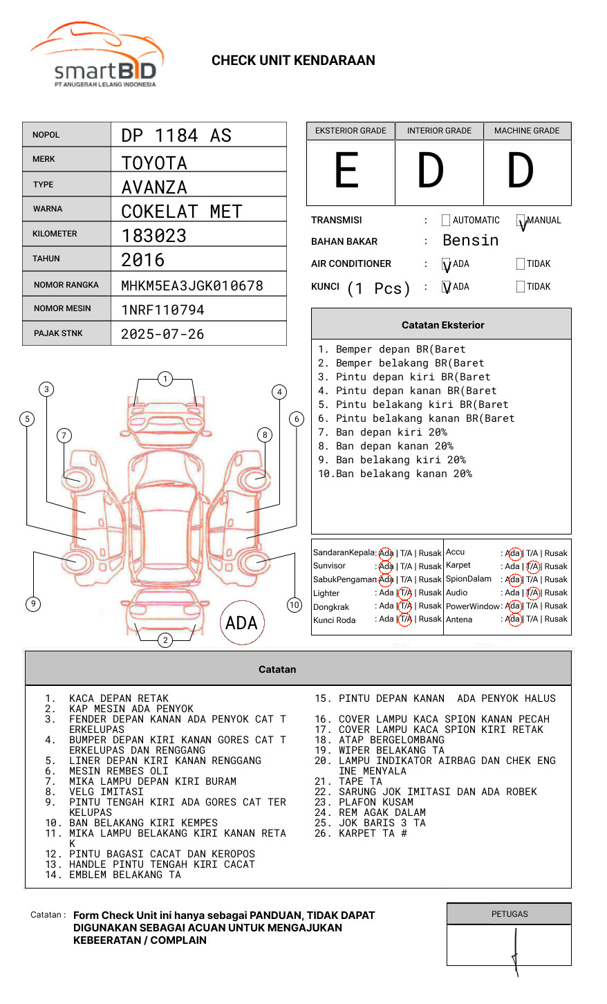 SEBELUM MELAKUKAN PENAWARAN UNIT PESERTA LELANG WAJIB MELAKUKAN PENGECEKAN UNIT DAN DOKUMEN TERLEBIH DAHULU // PIC RUDAL 0821 9140 0425 / MUHAMMAD DARWIS 082348587430 // UNIT DIKENAKAN BIAYA PPN 1.1% DARI HARGA TERBENTUK //
