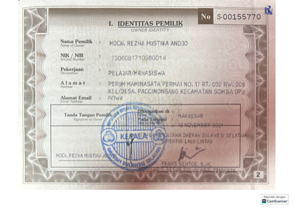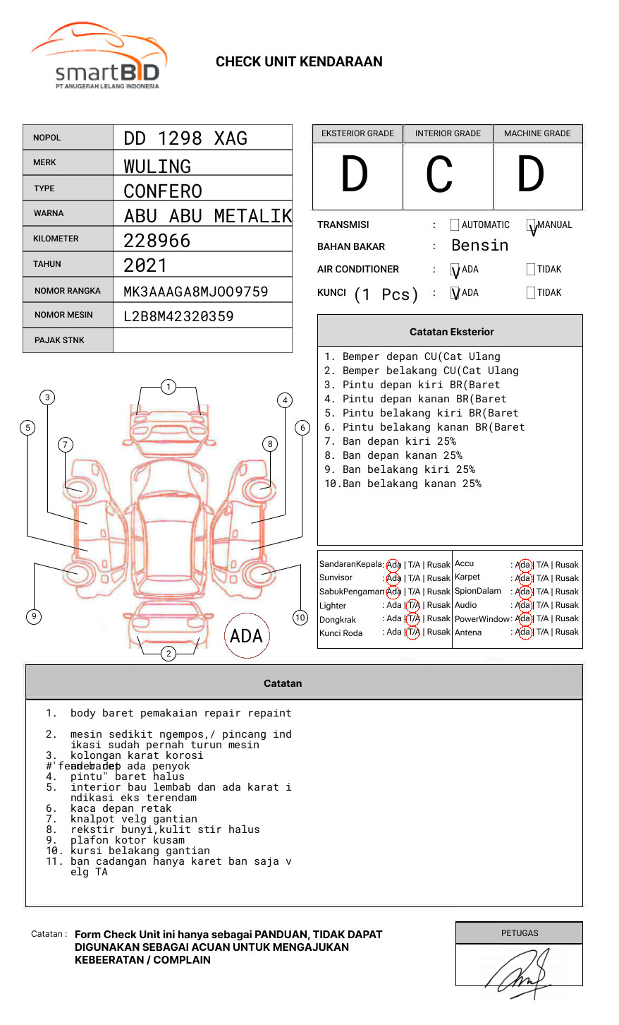 SEBELUM MELAKUKAN PENAWARAN HARAP CEK KONDISI UNIT SERTA DOKUMEN TERLEBIH DAHULU// SOFTCOPY BPKB TA// UNIT TIDAK DAPAT DILAKUKAN CEK E-SAMSAT (PENAWAR WAJIB MENGECEK TERLEBIH DAHULU)// NOSIN FISIK BERKARAT// TERDAPAT PERBEDAAN NOPOL FISIK DGN DOKUMEN// PADA NOPOL FISIK "DD 1298 XAG" SEDANGKAN NOPOL PADA DOKUMEN "DD 1217 LE"// INDIKASI NOPOL PALSU/BBN GANTUNG// LEMBAR PERUBAHAN IDENTITAS TA// PIC MAS UD : 081213061687