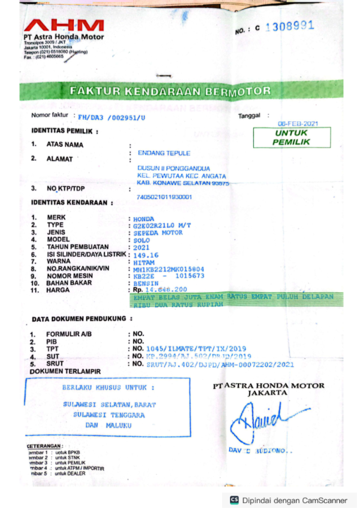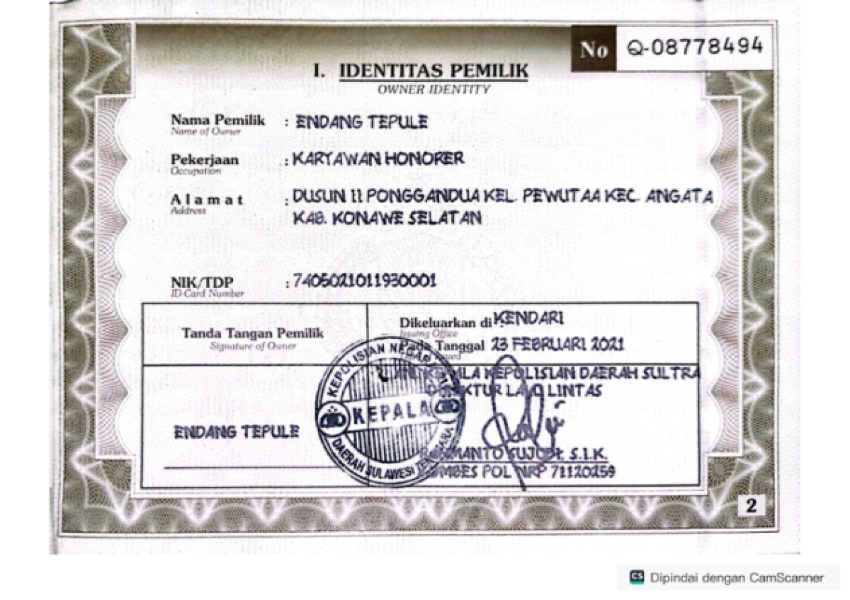 | No. Polisi | : | DT 5020 TH |