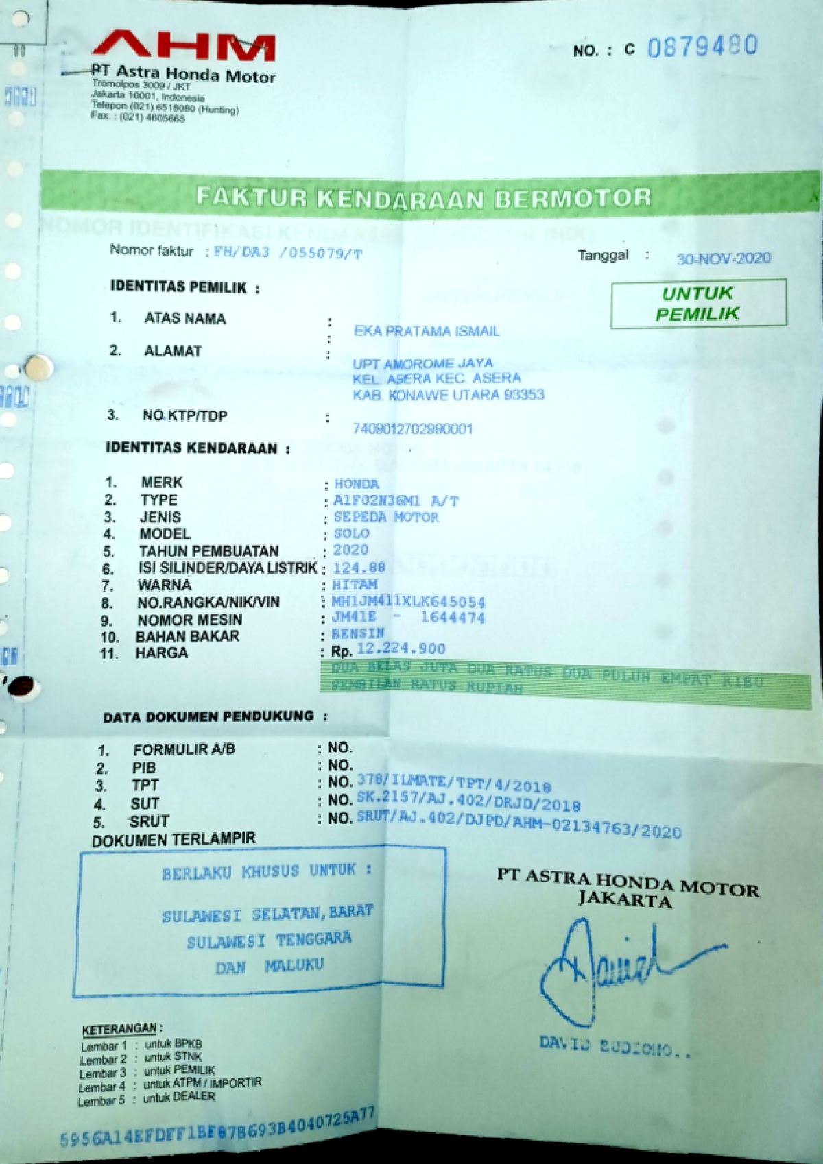 | No. Rangka | : | MH1JM411XLK645054 |