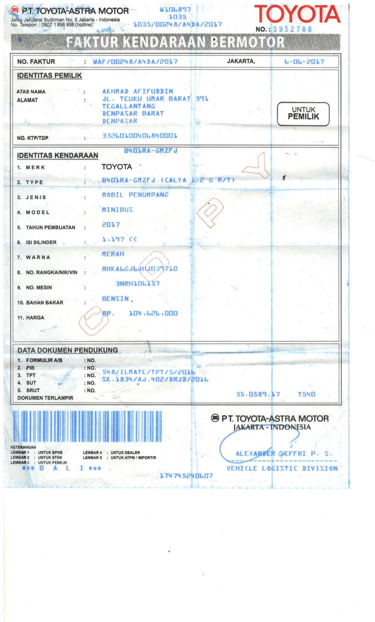 No. Rangka | : | MHKA6GJ6JHJ039710 |