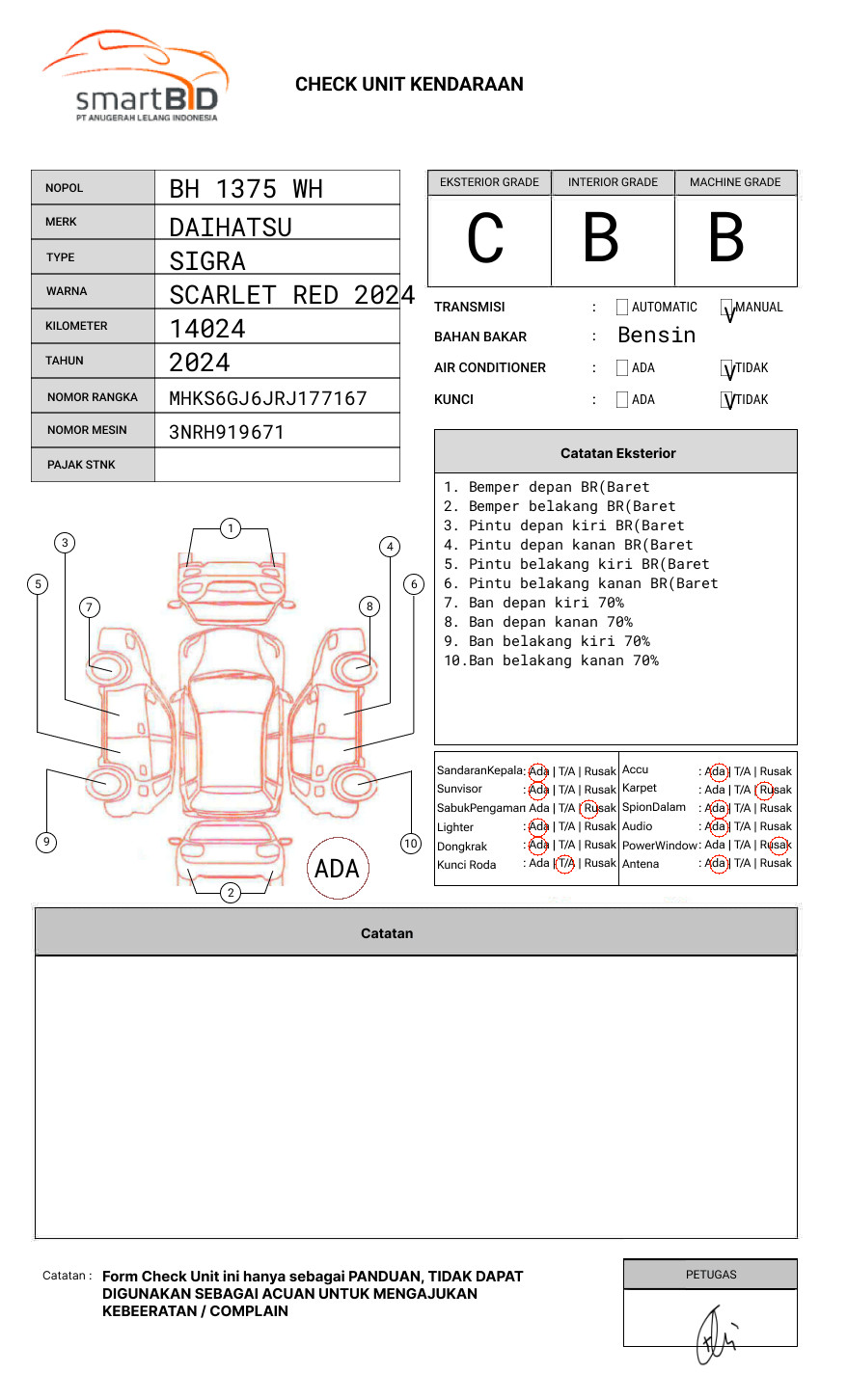 SEBELUM MELAKUKAN PENAWARAN UNIT PESERTA LELANG WAJIB MELAKUKAN PENGECEKAN UNIT DAN DOKUMEN TERLEBIH DAHULU // PIC FAJAR: +62 822-2970-6821// UNIT DIKENAKAN BIAYA PPN 1.1% DARI HARGA TERBENTUK // UNIT DIKENAKAN BIAYA ROYA FIDUSIA 100.000