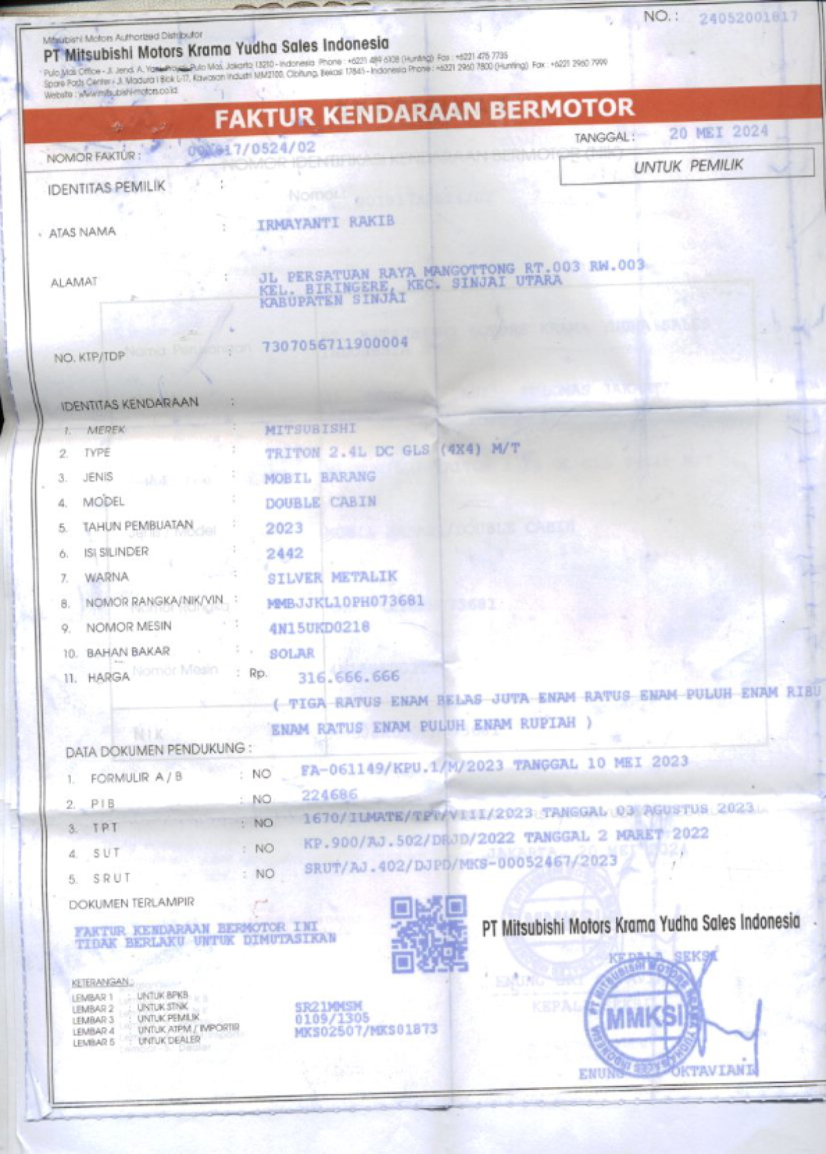 | No. Rangka | : | MMBJJKL10PH073681 |