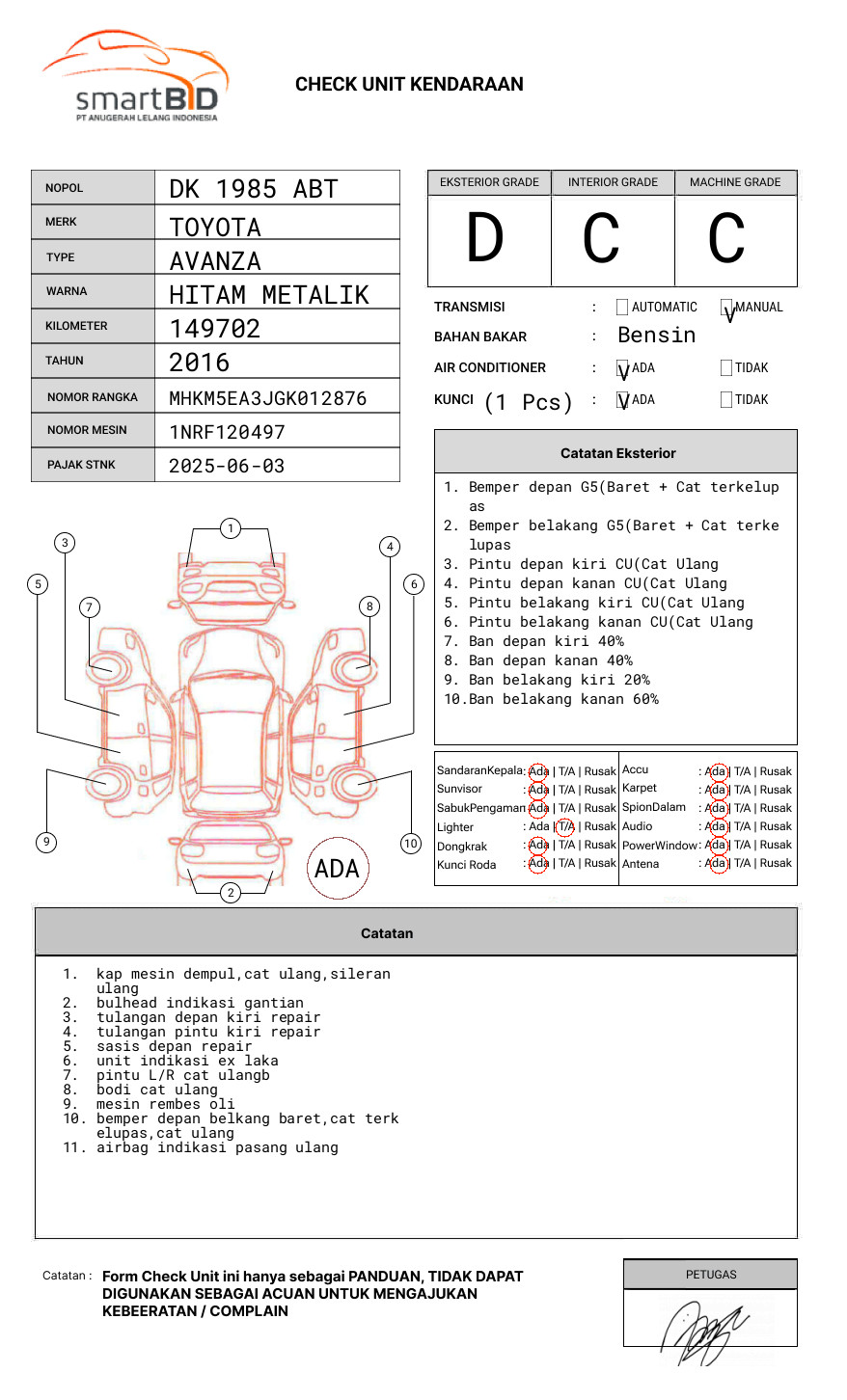 SEBELUM MELAKUKAN PENAWARAN UNIT PESERTA LELANG WAJIB MELAKUKAN PENGECEKAN UNIT DAN DOKUMEN TERLEBIH DAHULU // PIC JEMY : 0852-5833-5777 // INSPEKSI AGUNG : 0852-3671-4592 // UNIT DIKENAKAN BIAYA PPN 1.1% DARI HARGA TERBENTUK //