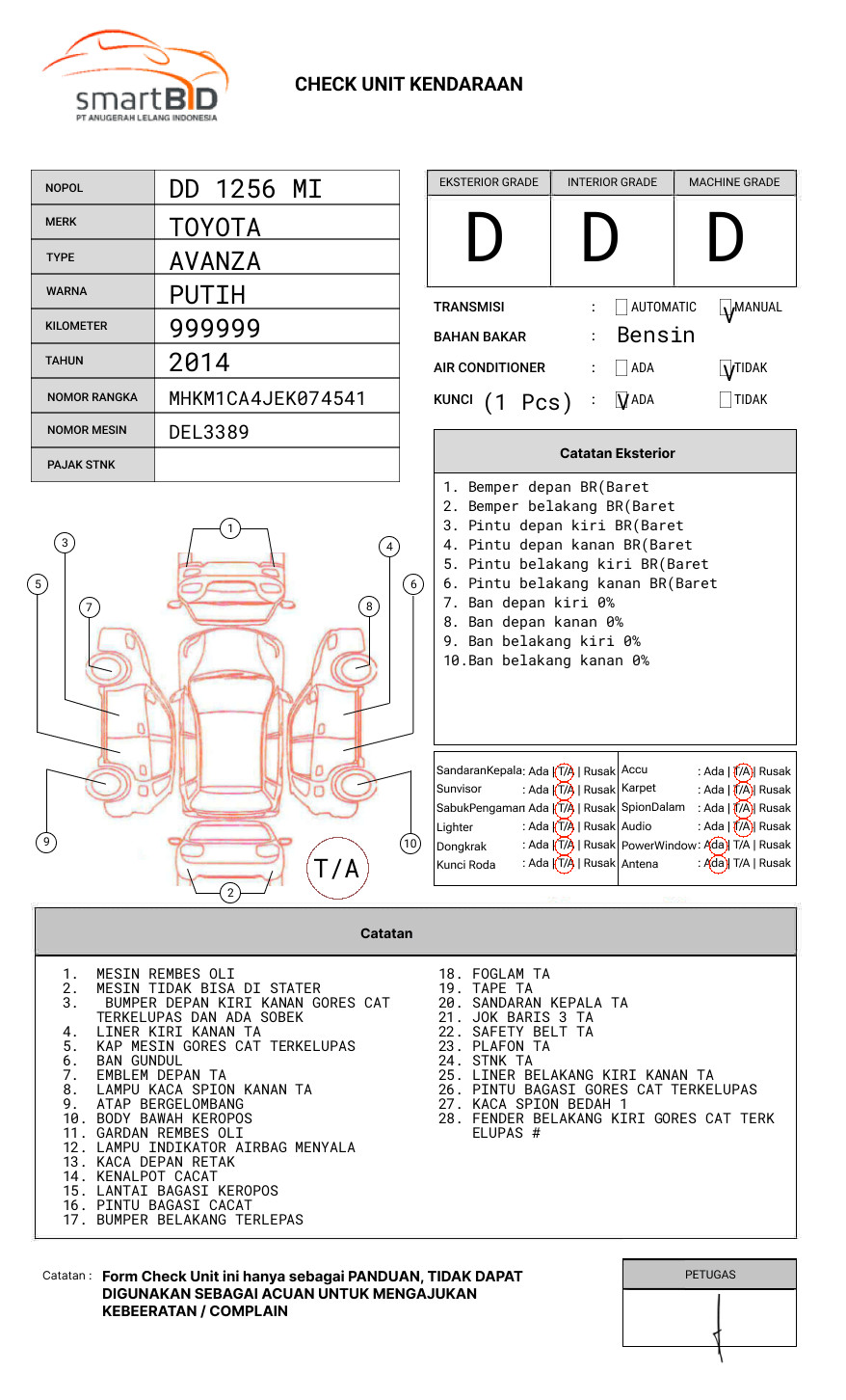 SEBELUM MELAKUKAN PENAWARAN UNIT PESERTA LELANG WAJIB MELAKUKAN PENGECEKAN UNIT DAN DOKUMEN TERLEBIH DAHULU // PIC RUDAL 0821 9140 0425 / MUHAMMAD DARWIS 082348587430 // UNIT DIKENAKAN BIAYA PPN 1.1% DARI HARGA TERBENTUK //