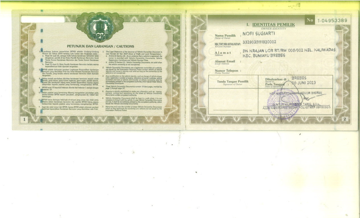 | No. Polisi | : | G 1891 TJ |