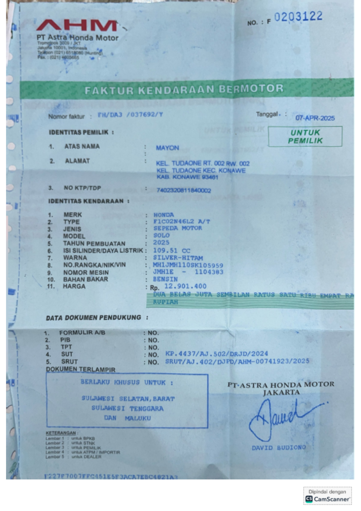 | No. Rangka | : | MH1JMH110SK105959 |