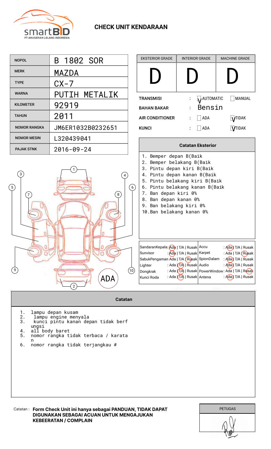 SEBELUM MELAKUKAN PENAWARAN UNIT PESERTA LELANG WAJIB MELAKUKAN PENGECEKAN UNIT DAN DOKUMEN TERLEBIH DAHULU // PIC MIRZA : 0822-3357-3376 / PIC RESKI 0853-4884-2551 //