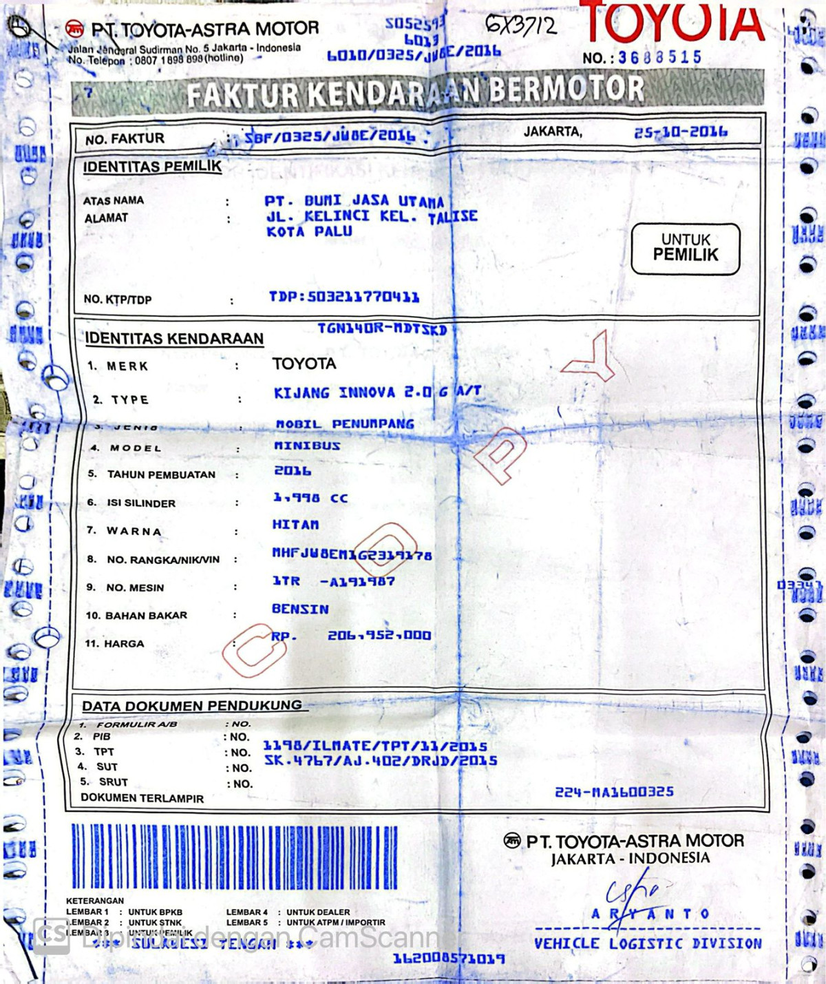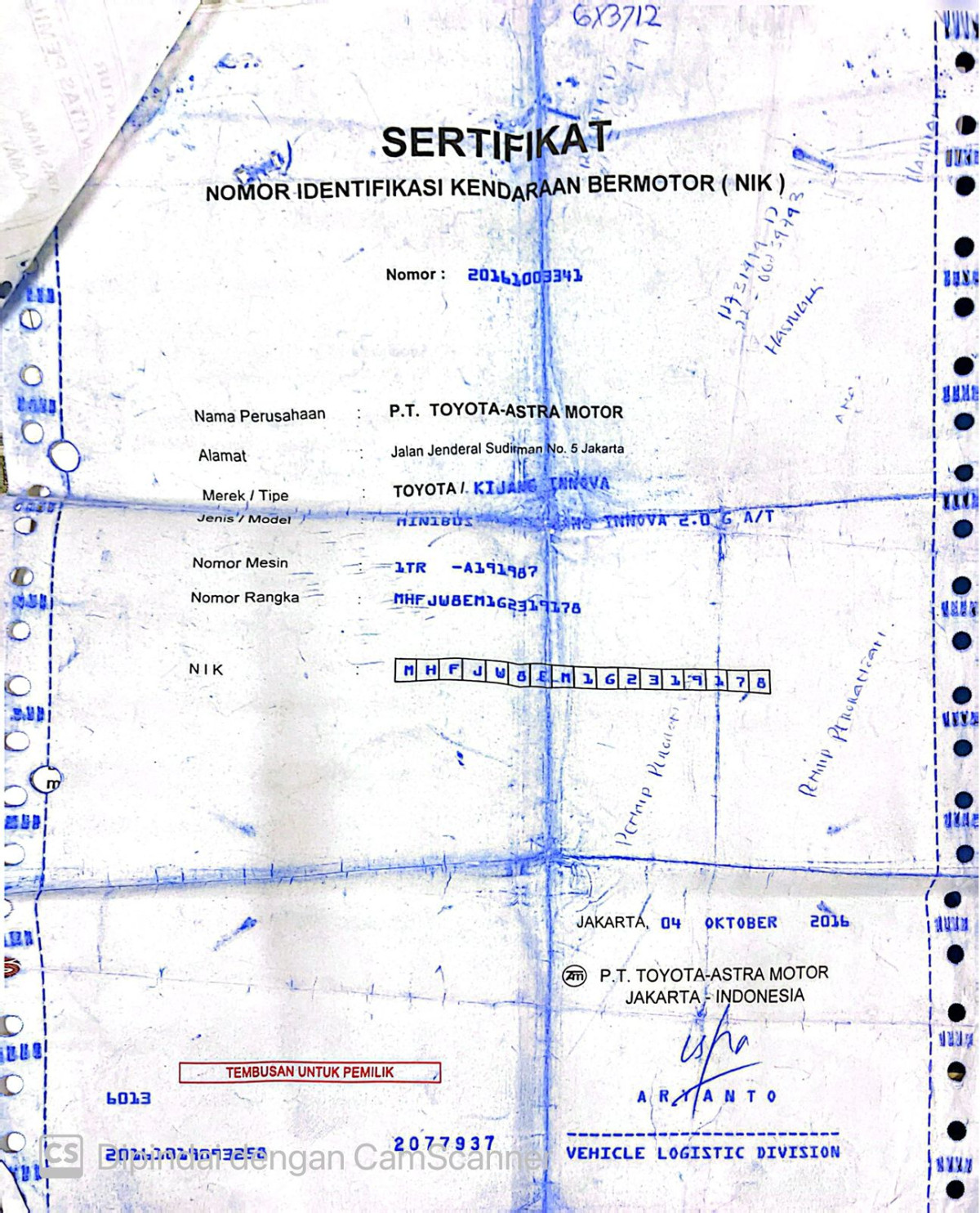 No. Mesin | : | 1TRA191987 |