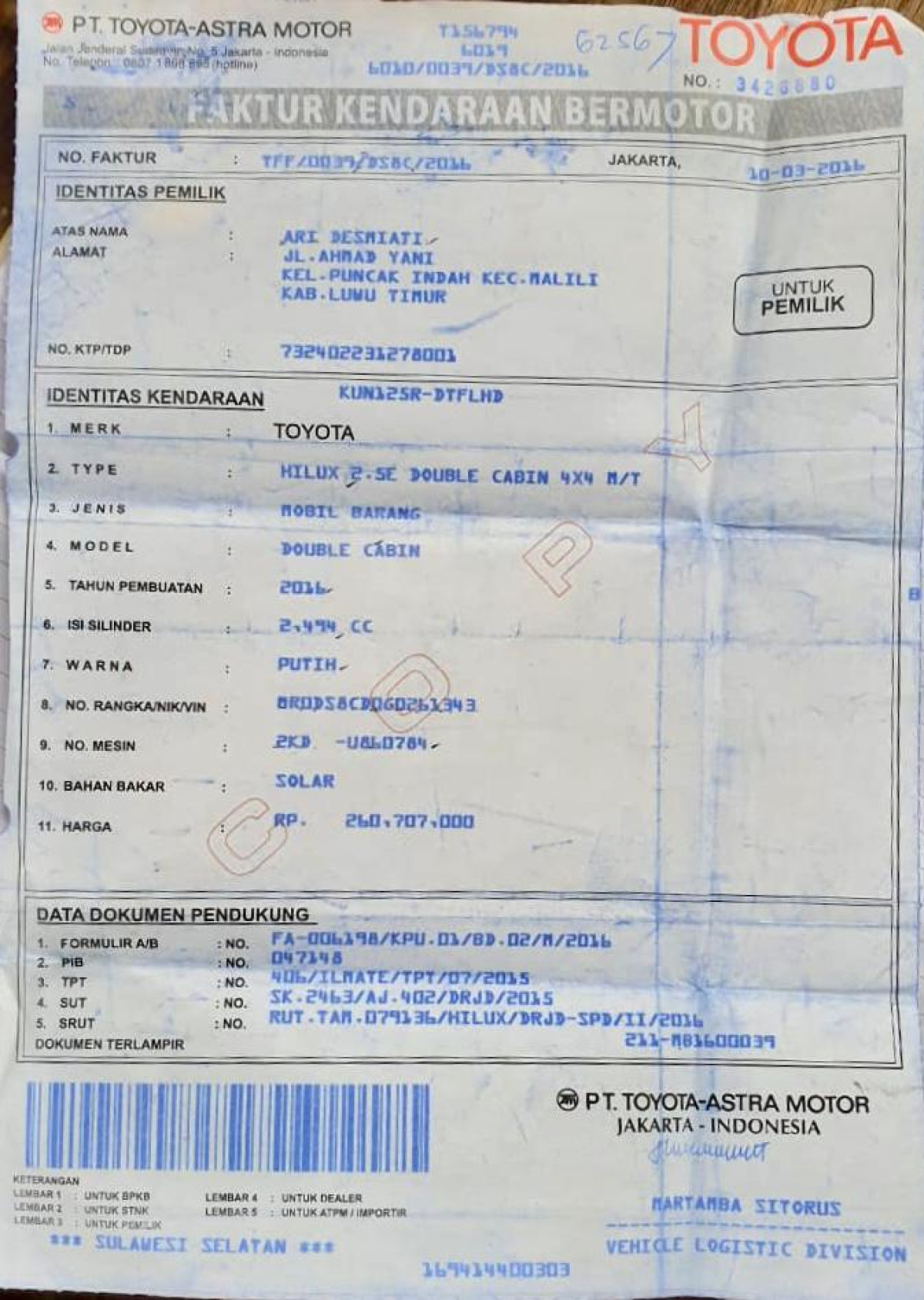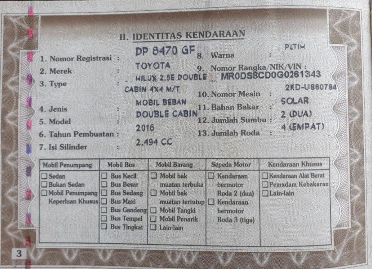 NOPOL FISIK T/A // UNIT TIDAK DILAKUKAN PENGECEKAN OLEH TIM SMARTBID// SEBELUM MELAKUKAN PENAWARAN HARAP CEK KONDISI UNIT DAN DOKUMEN TERLEBIH DAHULU// WAJIB MENGHUBUNGI PIC DAN DATANG KE LOKASI UNTUK PENGECEKAN UNIT// UNIT DILELANG APA ADANYA PERMASALAHAN YANG TIMBUL DILUAR TANGGUNG JAWAB SMARTBID// PENGAMBILAN UNIT SLIDE H+2 DARI PELUNASAN // JIKA INGIN MENGAMBIL UNIT HARAP UNTUK KONFIRMASI DAHULU KE SMARTBID // JIKA YANG MENGAMBIL BIDDER HARAP MEMBAWA KTP ASLI // JIKA PENGAMBILAN DIWAKILKAN WAJIB MEMBAWA SURAT KUASA ASLI // UNIT DIKENAKAN BIAYA PPN 1,1% DARI HARGA TERBENTUK// LOKASI UNIT HUBUNGI Bpk. Rudolf 0812-4270-3822 / CS PUSAT 081188089292// Mesin tidak berfungsi (terbongkar), Komponen mesin tidak lengkap, Accu T/A, Ban cadangan T/A, Alat mobil T/A, Radiator rusak, Lantai bak berkarat, Mesin rembes oli, Indikasi ECU T/A//Dinamo Starter | Engine Block | Power Steering | Muffler | ECU | Rack Steer | Tire (Fr-L) | Engine Services (Heavy) | Air Filter | Tire (Fr-R) | Tire (Rr-R) | Tire (spare) | Spring (RR) | Rim (spare) | Tire (Rr-L) | Brake Master | Gasket Cover Head | Spring (FR) | Aircon Evaporator | Gasket Cylinder Head | Gear Box Overhaul | Coil Ignition | Radiator Fan | Brake Pad (Fr) | Brake Pad (Rr) | Radiator | Engine Block Head | Injector | Fan Belt | Battery | Clutch Plate | Remote | Spark Plug(s) | Engine Mounting | Spare Key (immobilizer)/Ceiling Lamp (Fr) | Carpet | Ceiling Trim | Aircon Panel | Bolt Crane and Jack | Interior Saloon | Head Unit | Tool Kit/Door Repair (Rr-R) | Door Repair (Fr-L) | Door Repair (Fr-R) | Door Repair (Rr-L) | Taillight (Rr-L) | Turn Lamp (Rr-L) | Rim cover (Fr-L) | Emblem | Rim cover (Rr-L) | Rim cover (Fr-R) | Fog Lamp (L) | Rim cover (Rr-R) | License Plat | Engine Hood Repair | Grilles | Fender Repair (Fr-R) | Cargo Panel Repair (Deck) | Fog Lamp (R ) | Turn Lamp (Rr-R) | Taillight (Rr-R) | Side Skirt Repair (R) | Windshield Wiper | Roof Repair | Headlight (Fr-R) | Side Skirt Repair (L) | Mirror (R ) | Mirror (L) | Turn Lamp (Fr-L) | Turn Lamp (Fr-R) | Headlight (Fr-L) | Fender Repair (Fr-L) | Bumper Repair (Fr)