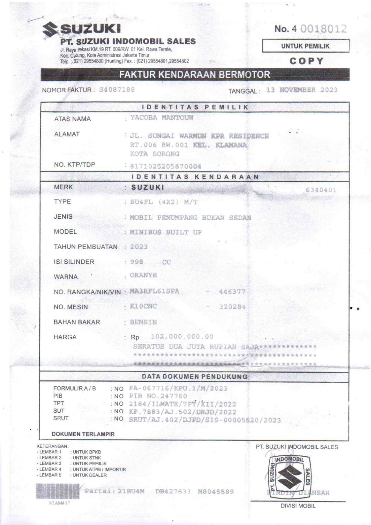 FOTO NOKA & NOSIN T/A // STNK BERUPA FOTO SCAN // UNIT TIDAK DILAKUKAN PENGECEKAN OLEH TIM SMARTBID// SEBELUM MELAKUKAN PENAWARAN HARAP CEK KONDISI UNIT DAN DOKUMEN TERLEBIH DAHULU// WAJIB MENGHUBUNGI PIC DAN DATANG KE LOKASI UNTUK PENGECEKAN UNIT// UNIT DILELANG APA ADANYA PERMASALAHAN YANG TIMBUL DILUAR TANGGUNG JAWAB SMARTBID// PENGAMBILAN UNIT SLIDE H+2 DARI PELUNASAN // JIKA INGIN MENGAMBIL UNIT HARAP UNTUK KONFIRMASI DAHULU KE SMARTBID // JIKA YANG MENGAMBIL BIDDER HARAP MEMBAWA KTP ASLI // JIKA PENGAMBILAN DIWAKILKAN WAJIB MEMBAWA SURAT KUASA ASLI // UNIT DIKENAKAN BIAYA PPN 1,1% DARI HARGA TERBENTUK// HUBUNGI PIC RATNA 0822-4805-9957 / INFORMASI LENGKAP UNIT HUB CS PUSAT 0811119678