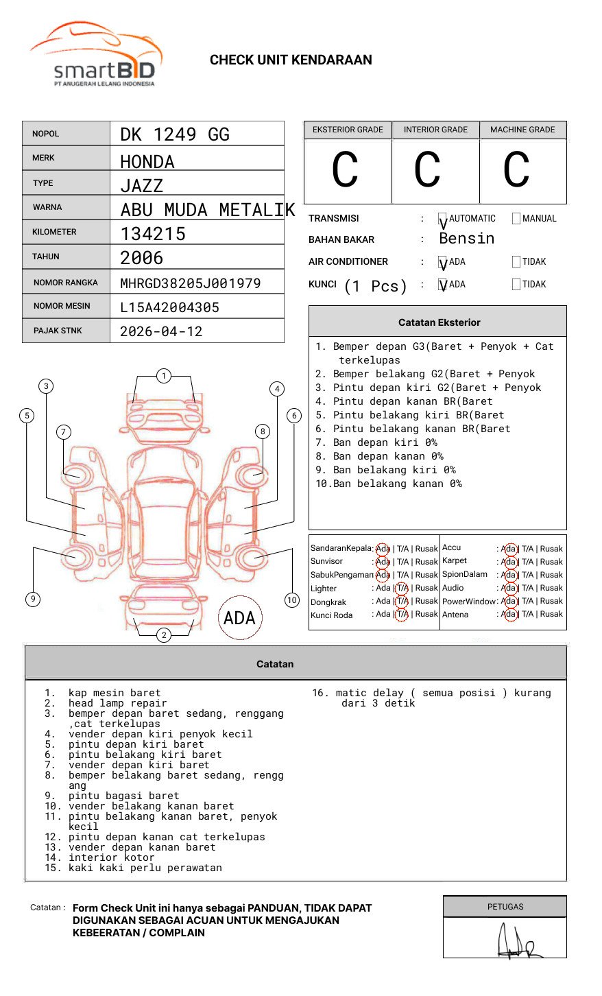 SEBELUM MELAKUKAN PENAWARAN UNIT PESERTA LELANG WAJIB MELAKUKAN PENGECEKAN UNIT DAN DOKUMEN TERLEBIH DAHULU // PIC AWAL +62 895-3231-57272 / ANDRI 085136886212 //