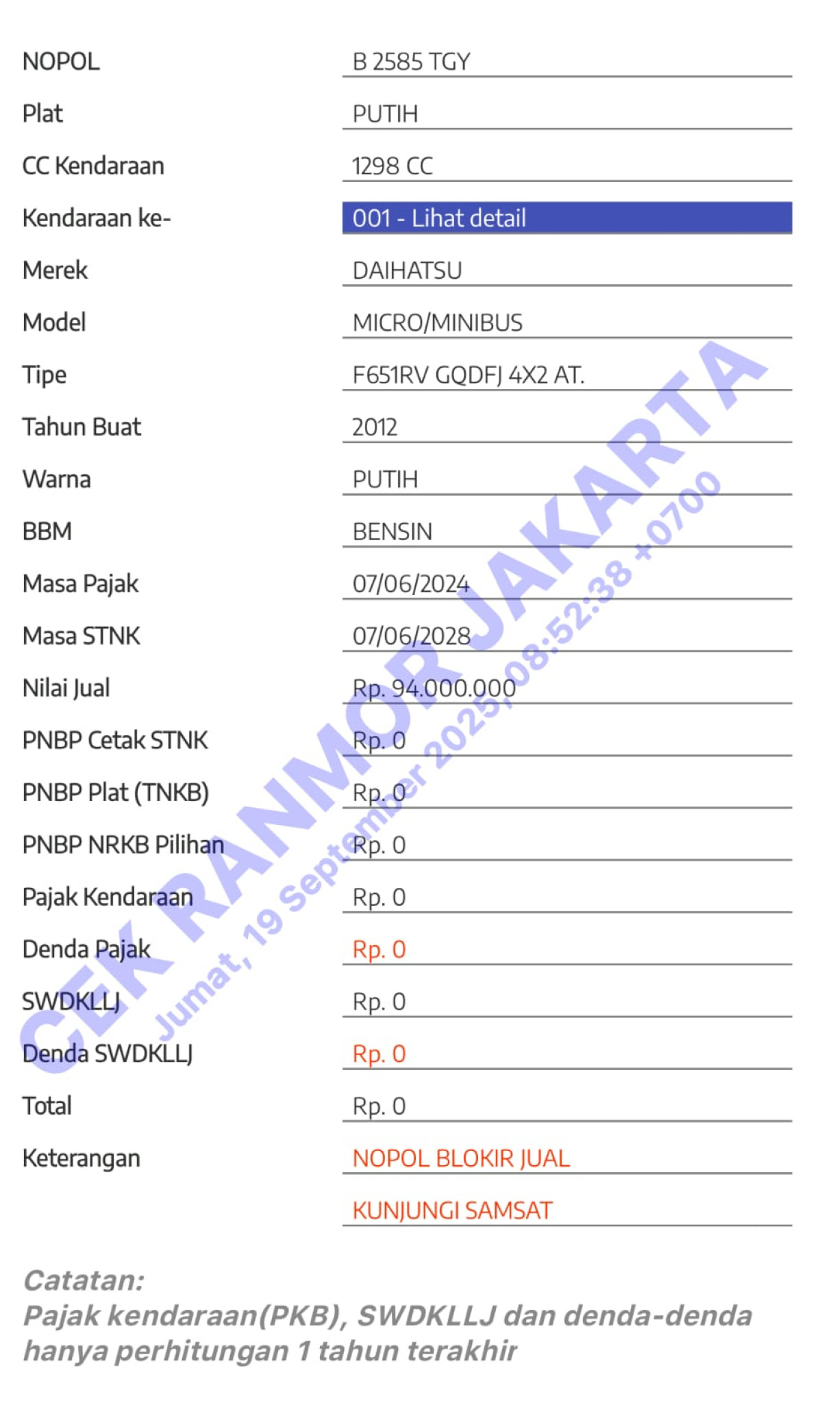 UNIT TIDAK DILAKUKAN PENGECEKAN OLEH TIM SMARTBID// SEBELUM MELAKUKAN PENAWARAN HARAP CEK KONDISI UNIT DAN DOKUMEN TERLEBIH DAHULU// WAJIB MENGHUBUNGI PIC DAN DATANG KE LOKASI UNTUK PENGECEKAN UNIT// UNIT DILELANG APA ADANYA PERMASALAHAN YANG TIMBUL DILUAR TANGGUNG JAWAB SMARTBID// PENGAMBILAN UNIT SLIDE H+2 DARI PELUNASAN // JIKA INGIN MENGAMBIL UNIT HARAP UNTUK KONFIRMASI DAHULU KE SMARTBID // JIKA YANG MENGAMBIL BIDDER HARAP MEMBAWA KTP ASLI // JIKA PENGAMBILAN DIWAKILKAN WAJIB MEMBAWA SURAT KUASA ASLI // UNIT DIKENAKAN BIAYA PPN 1,1% DARI HARGA TERBENTUK // LOKASI UNIT HUBUNGI CS PUSAT 081188089292// NOPOL FISIK TA