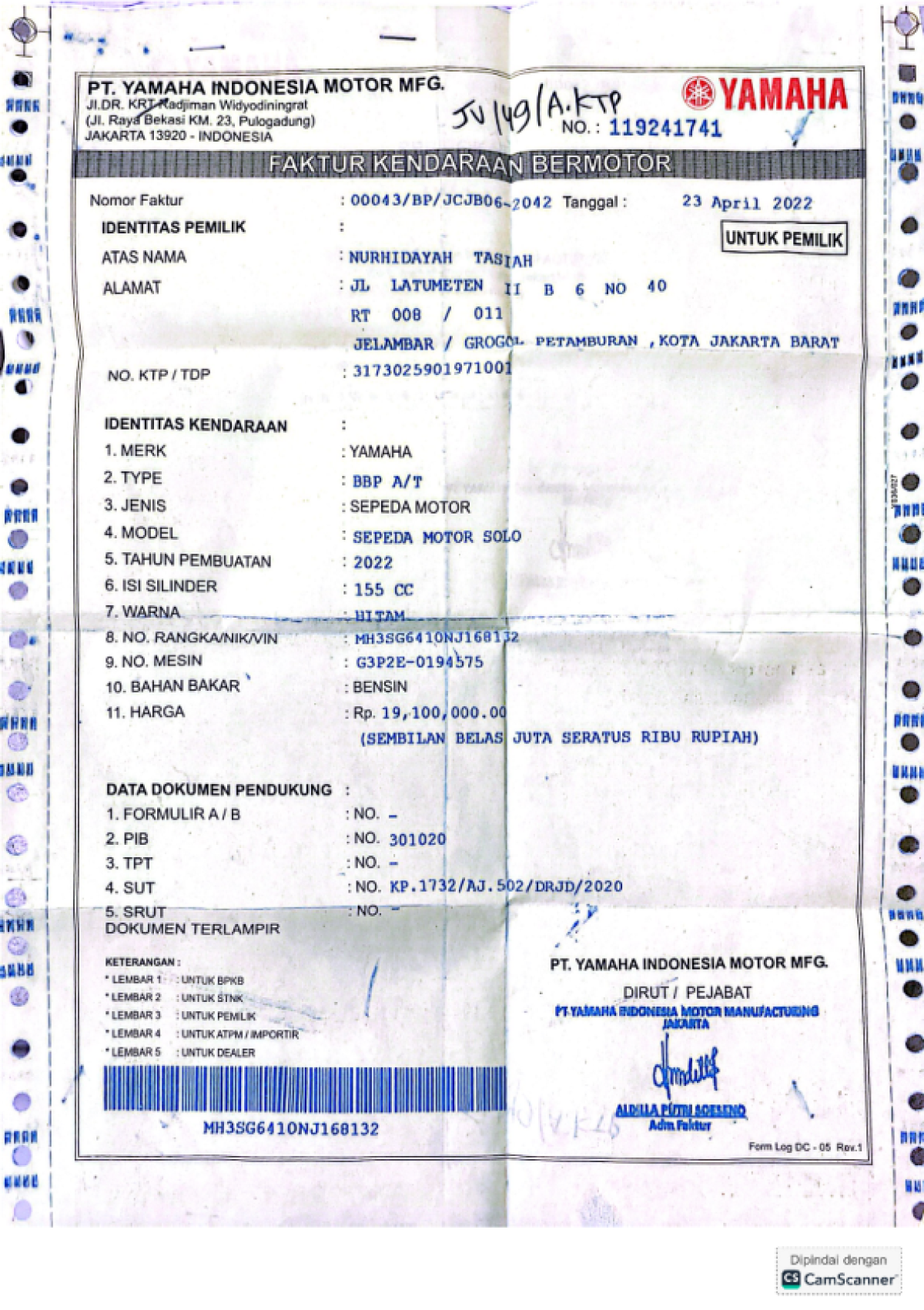 | No. Rangka | : | MH3SG6410NJ168132 |