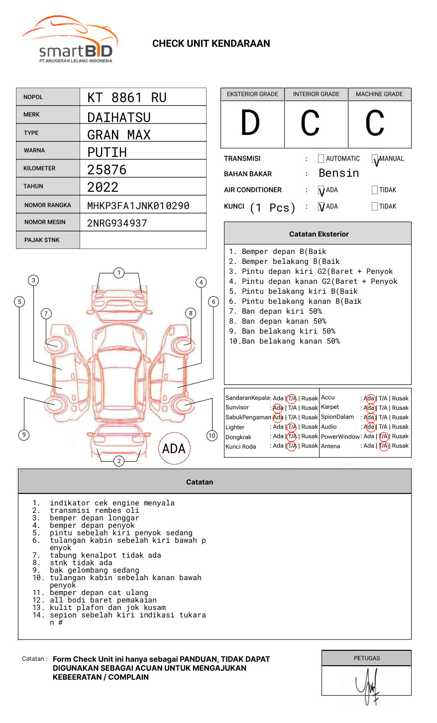 SEBELUM MELAKUKAN PENAWARAN UNIT PESERTA LELANG WAJIB MELAKUKAN PENGECEKAN UNIT DAN DOKUMEN TERLEBIH DAHULU // PIC PUTRA:+62 821-2783-7606 / GUSTI: +62 822-5053-1175 // UNIT DIKENAKAN BIAYA PPN 1.1% DARI HARGA TERBENTUK //UNIT DIKENAKAN BIAYA ROYA FIDUSIA 100.000