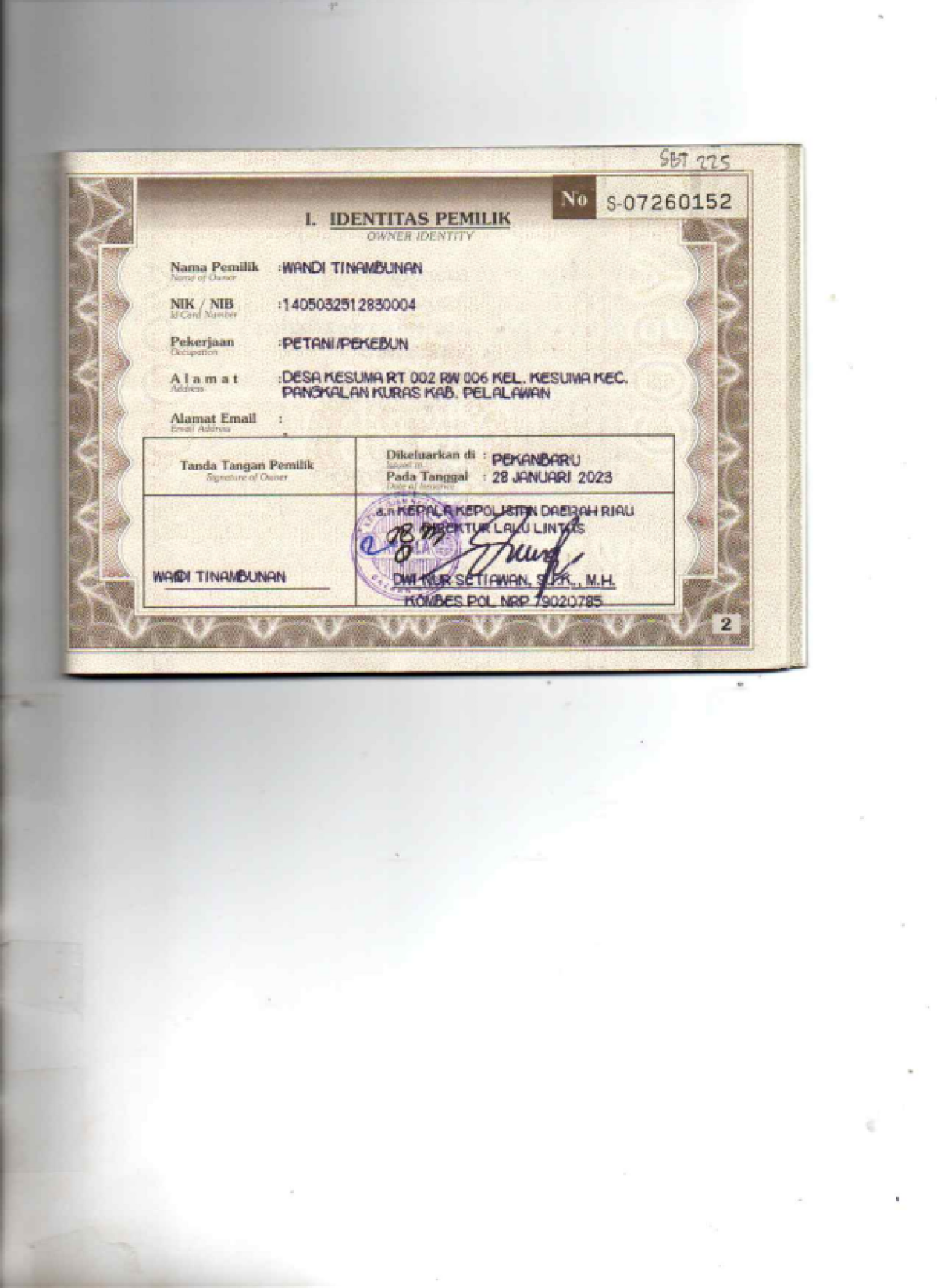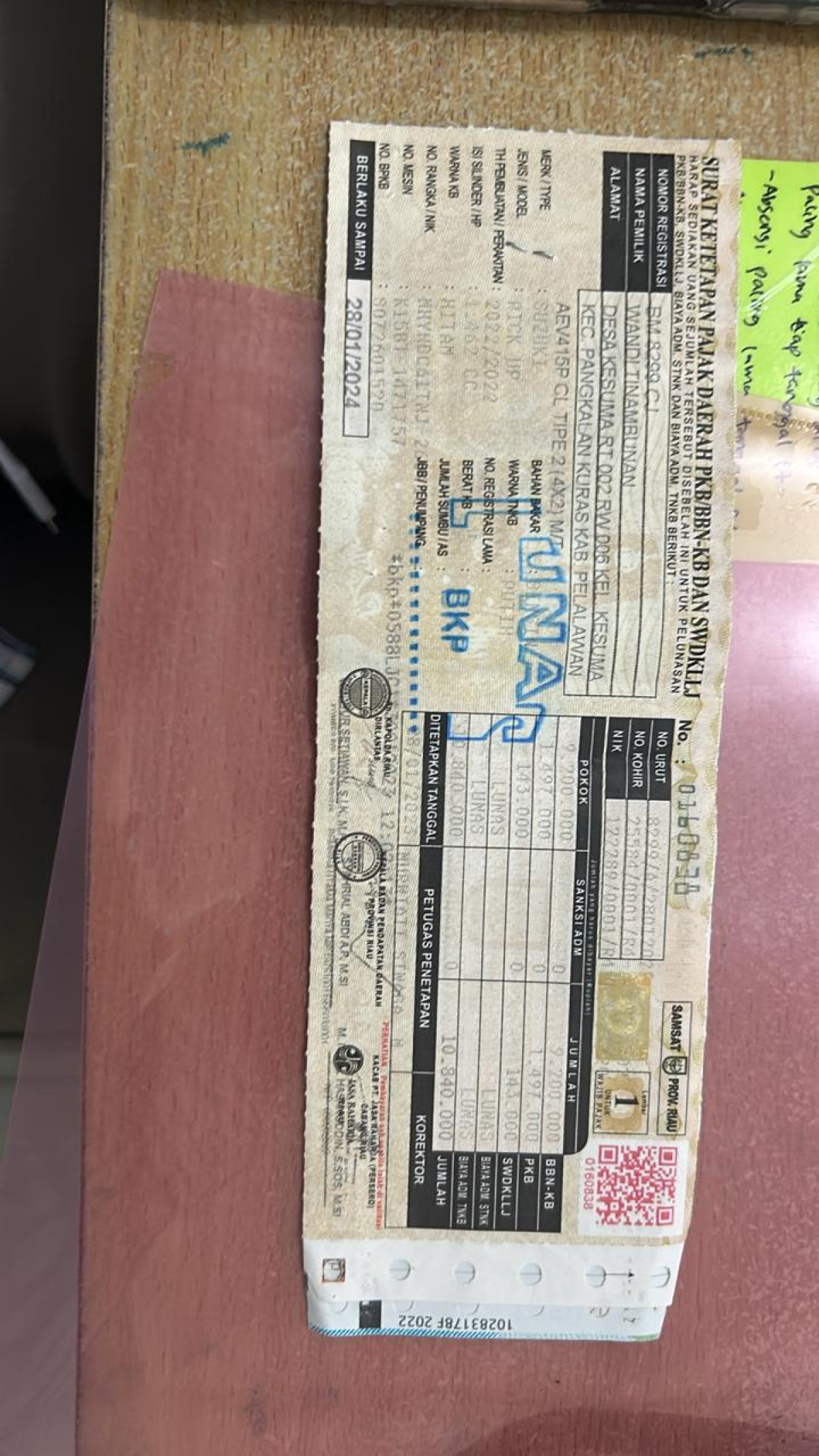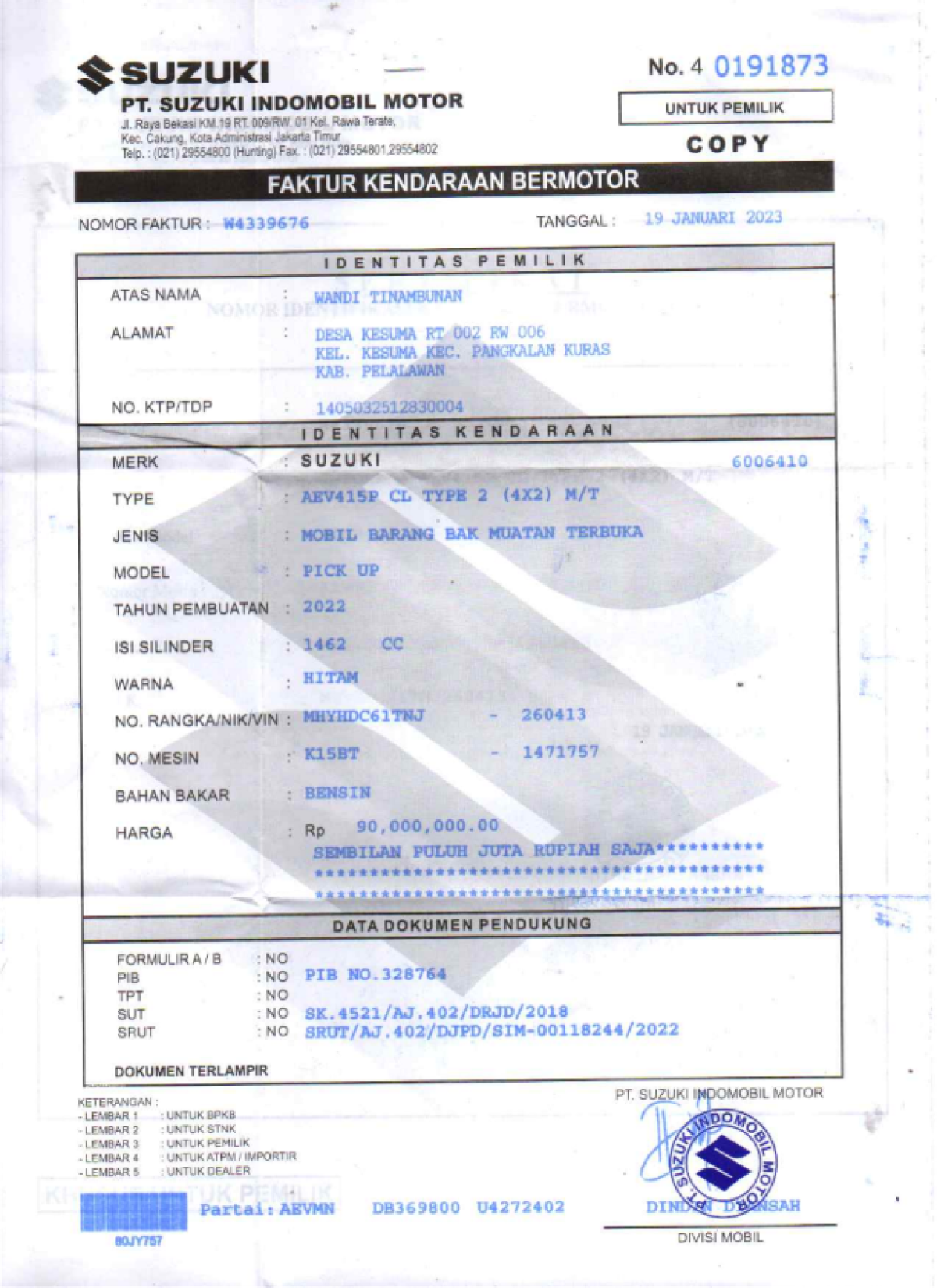 UNIT TIDAK DILAKUKAN PENGECEKAN OLEH TIM SMARTBID// SEBELUM MELAKUKAN PENAWARAN HARAP CEK KONDISI UNIT DAN DOKUMEN TERLEBIH DAHULU// WAJIB MENGHUBUNGI PIC DAN DATANG KE LOKASI UNTUK PENGECEKAN UNIT// UNIT DILELANG APA ADANYA PERMASALAHAN YANG TIMBUL DILUAR TANGGUNG JAWAB SMARTBID// PENGAMBILAN UNIT SLIDE H+2 DARI PELUNASAN // JIKA INGIN MENGAMBIL UNIT HARAP UNTUK KONFIRMASI DAHULU KE SMARTBID // JIKA YANG MENGAMBIL BIDDER HARAP MEMBAWA KTP ASLI // JIKA PENGAMBILAN DIWAKILKAN WAJIB MEMBAWA SURAT KUASA ASLI//UNIT DIKENAKAN BIAYA PPN 1,1% DARI HARGA TERBENTUK// HUBUNGI PIC SUCI	0823-6456-5174 // NFORMASI LENGKAP UNIT HUB CS PUSAT 0811119678//FOTO NOKA NOSIN TA